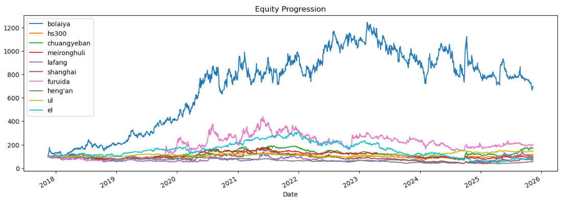 区间累计回报近5倍,最大回撤25.33%,投资组合的整体表现要好于珀莱雅个股。整个美容护理行业盈利能力一般,波动中高,夏普比率0.88有点鸡肋。(Cumulative Returns;Maximum Drawdown)