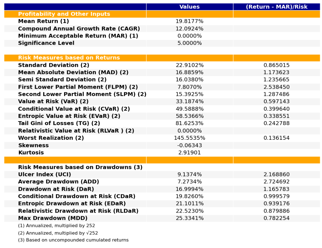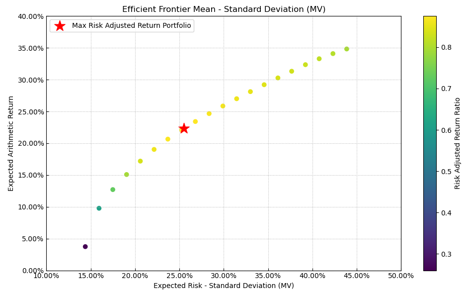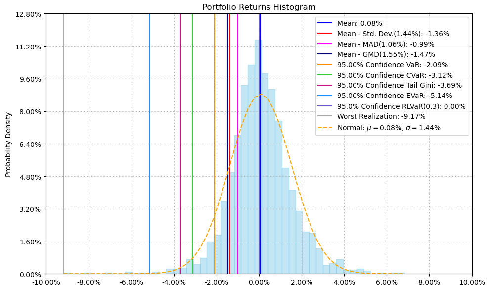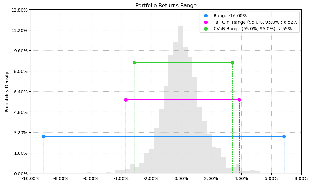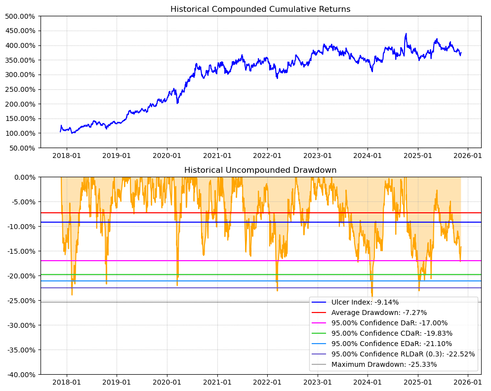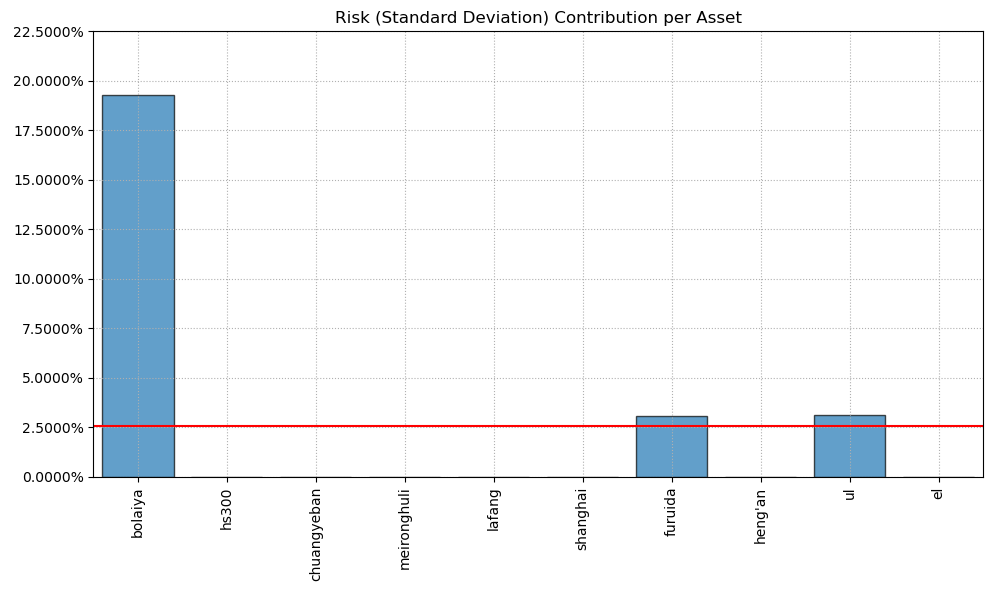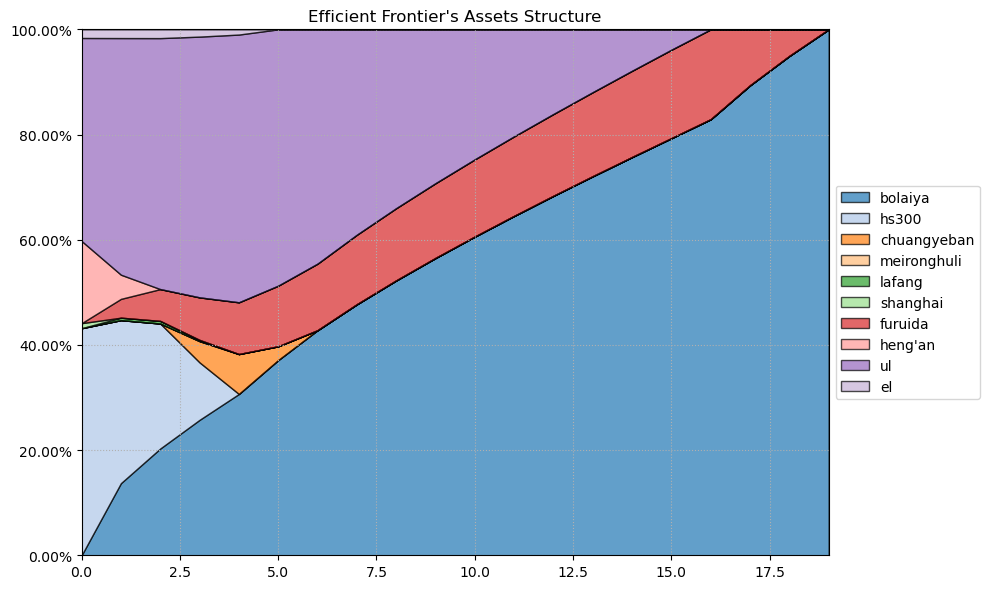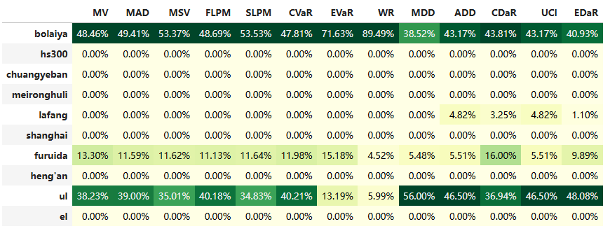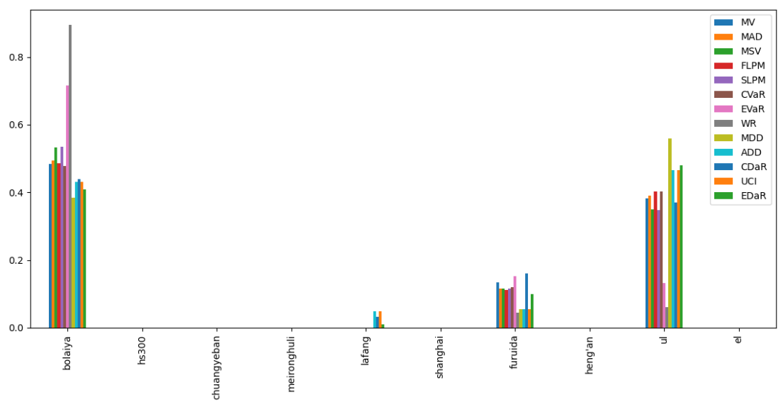 最后看下整个投资组合的情况,日度均值回报在0.08%,比上次测的建筑工程行业低50%,相应地7.55%的CVaR波动也会小很多。(Mean;CVaR)