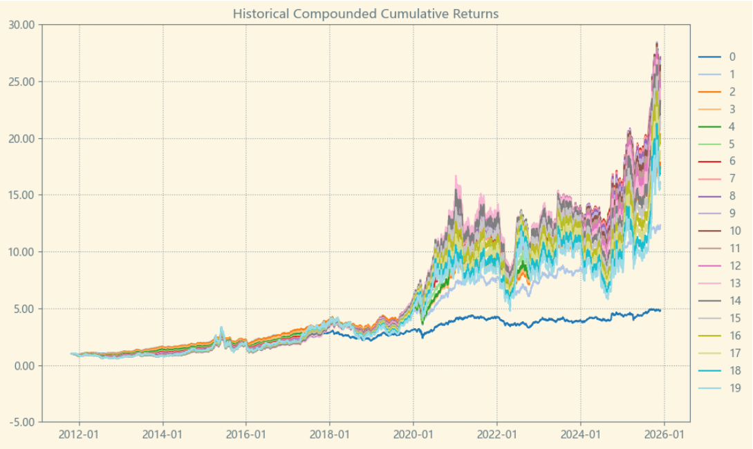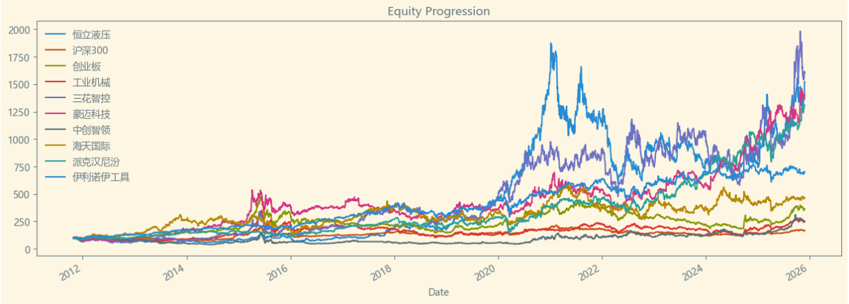 区间累计回报近18倍,最大回撤35.22%,投资组合的整体表现要好于恒立液压个股。整个工业机械行业盈利能力优异,波动中低,夏普比率1.21实属优秀。(Cumulative Returns;Maximum Drawdown)