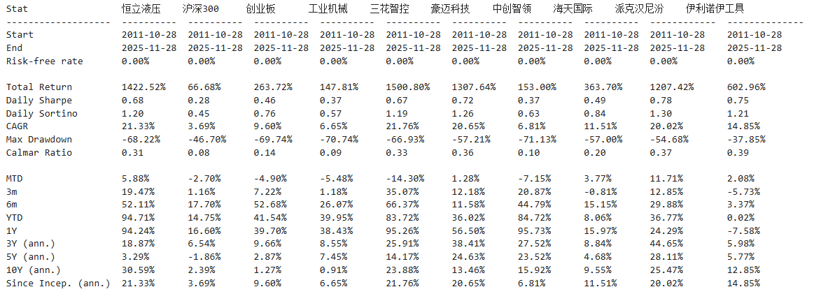 恒立液压,基本面表现亮眼,历史表现一骑绝尘,目前估值不算高,建议重点关注。整个工业机械行业历史表现卓尔不群,波动尚可,综合夏普比率极其诱人,建议重点关注,可以看看派克汉尼汾、豪迈科技。