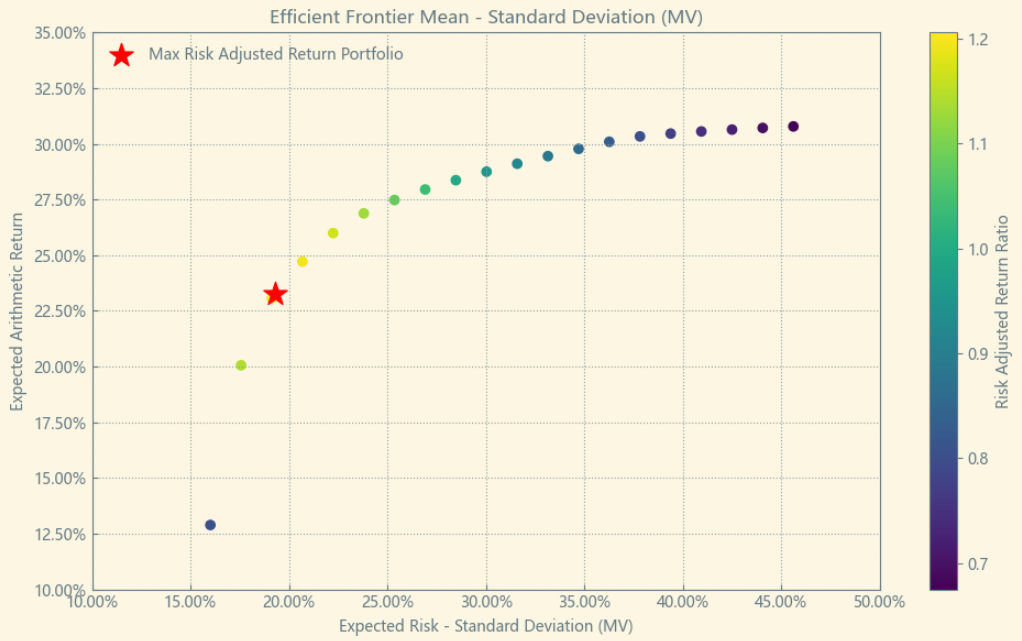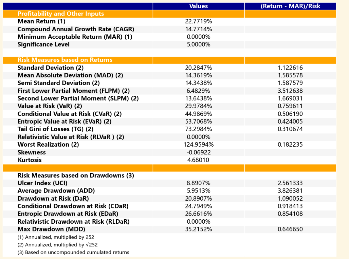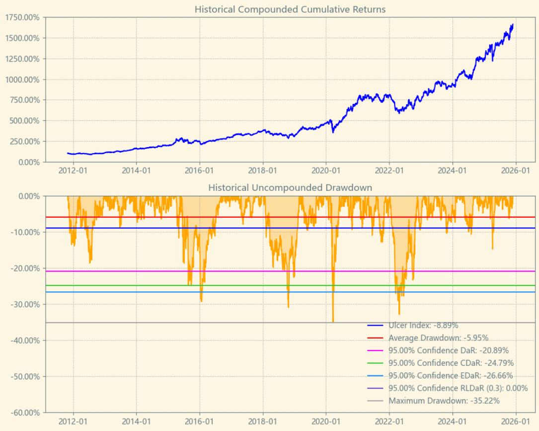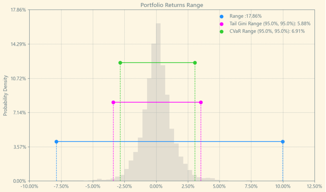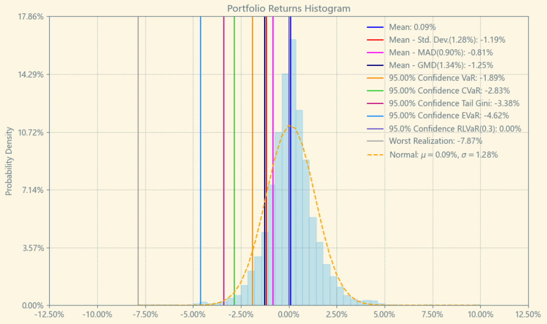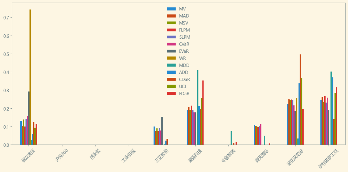最后看下整个投资组合的情况,日度均值回报在0.09%,比上次测的地产开发行业高30%,而且6.91%的CVaR波动还更小。(Mean;CVaR)