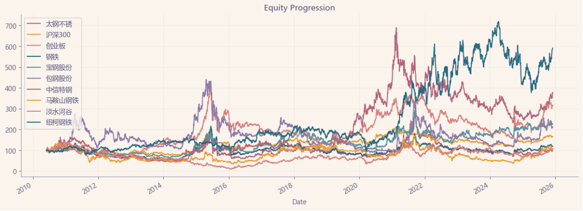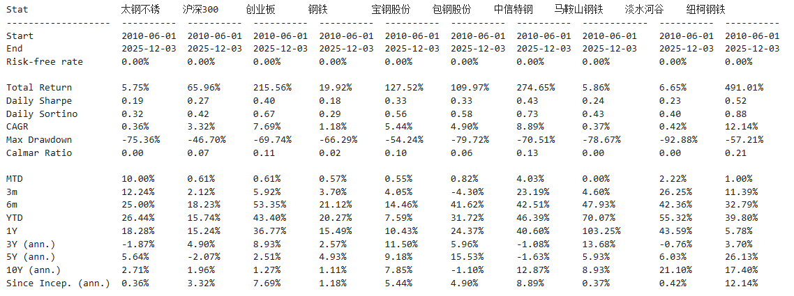 太钢不锈,基本面可圈可点,历史表现却令人大跌眼镜,目前估值低,可以当配置。整个钢铁行业历史表现平平无奇,波动偏大,综合夏普比率毫无竞争力,不建议关注,如果一定要配置的话,可以看看纽柯钢铁、中信特钢。
