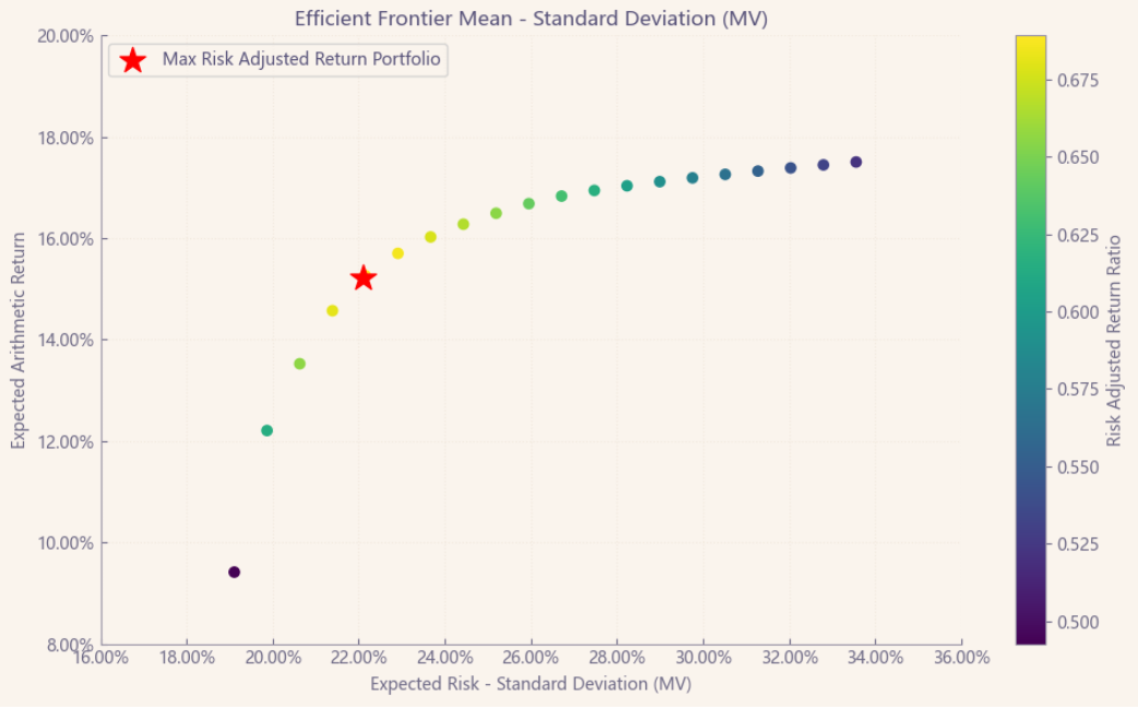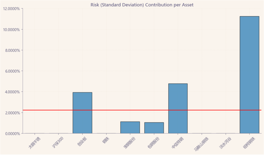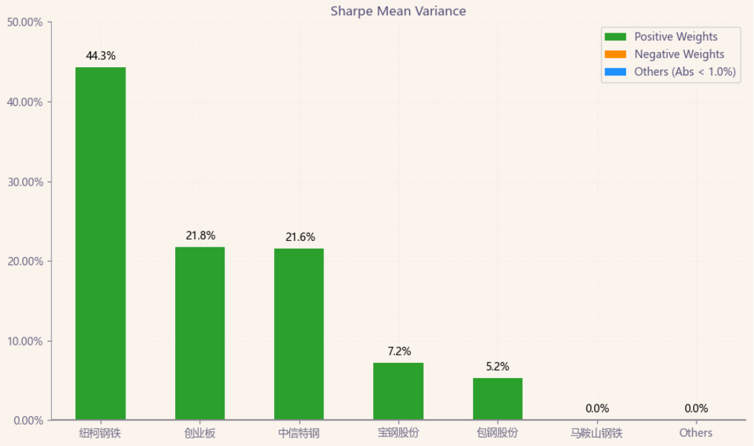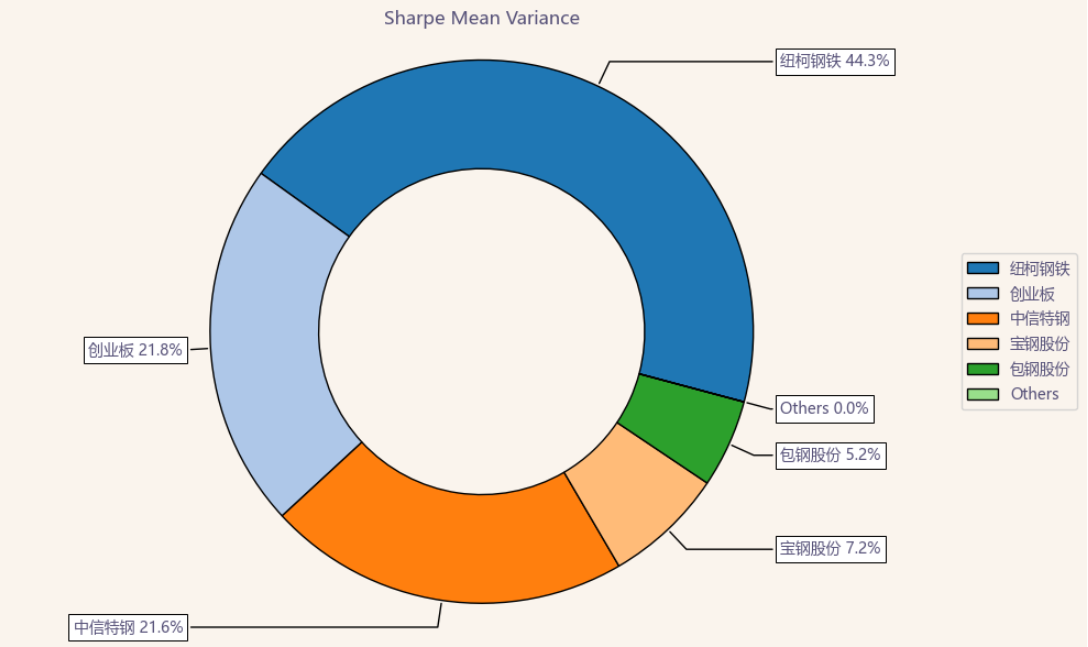 按最高夏普比率配置的话,系统给的权重为0,最高权重给了美股的纽柯钢铁占比44.3%。
