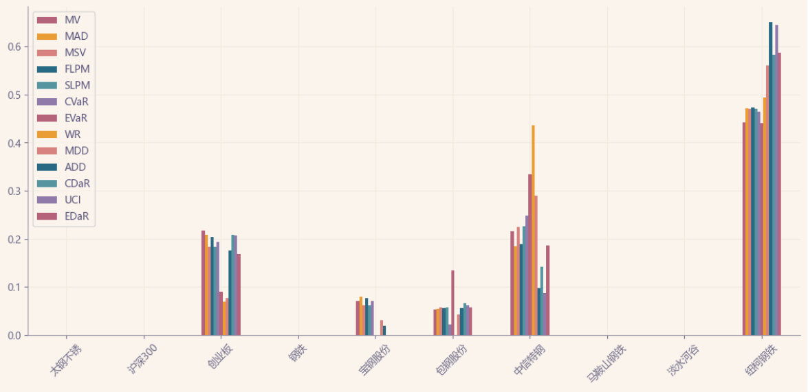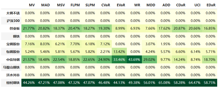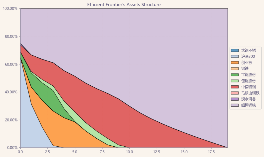如果换成其他约束,系统给的配置比例也大同小异,基本是在中信特钢和美股的纽柯钢铁之间做取舍了。
