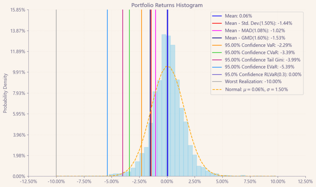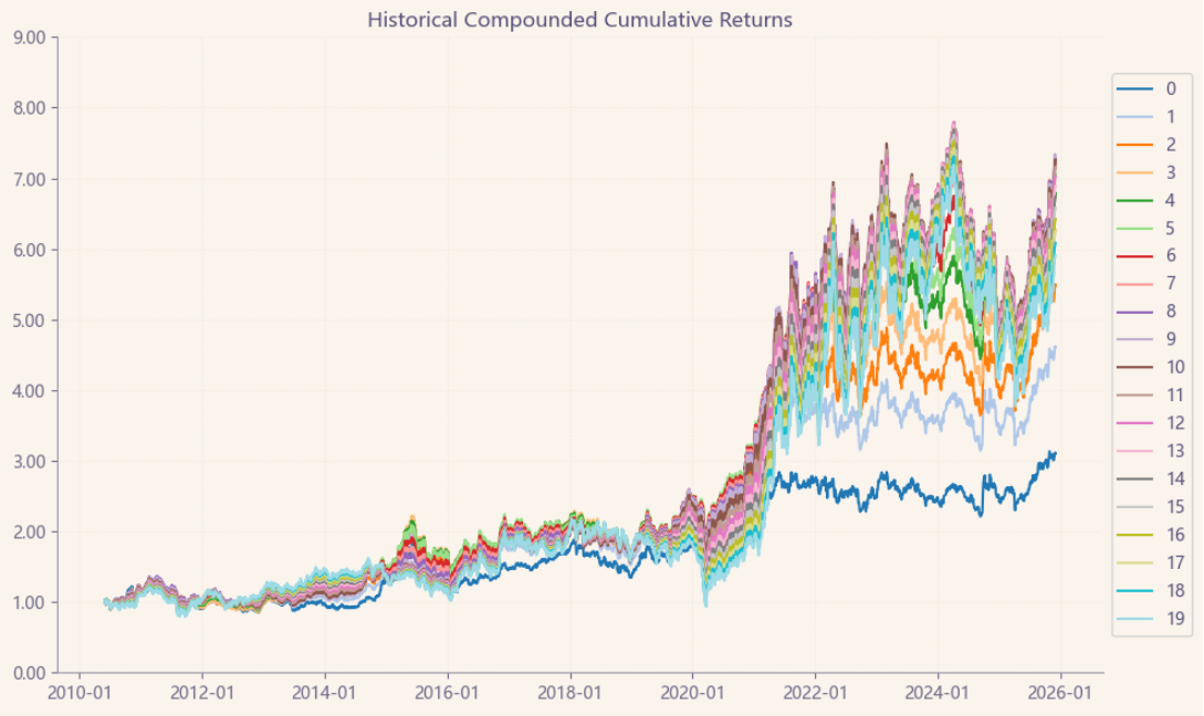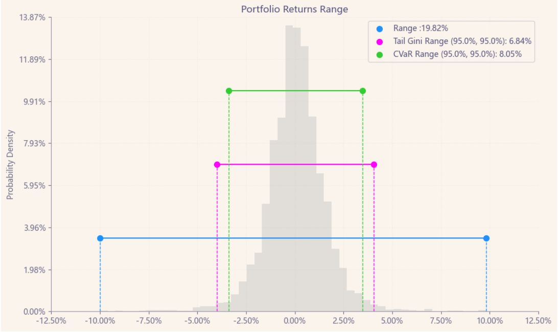 最后看下整个投资组合的情况,日度均值回报在0.06%,比上次测的商品化工行业低20%,相应地8.05%的CVaR波动也会小一些。(Mean;CVaR)