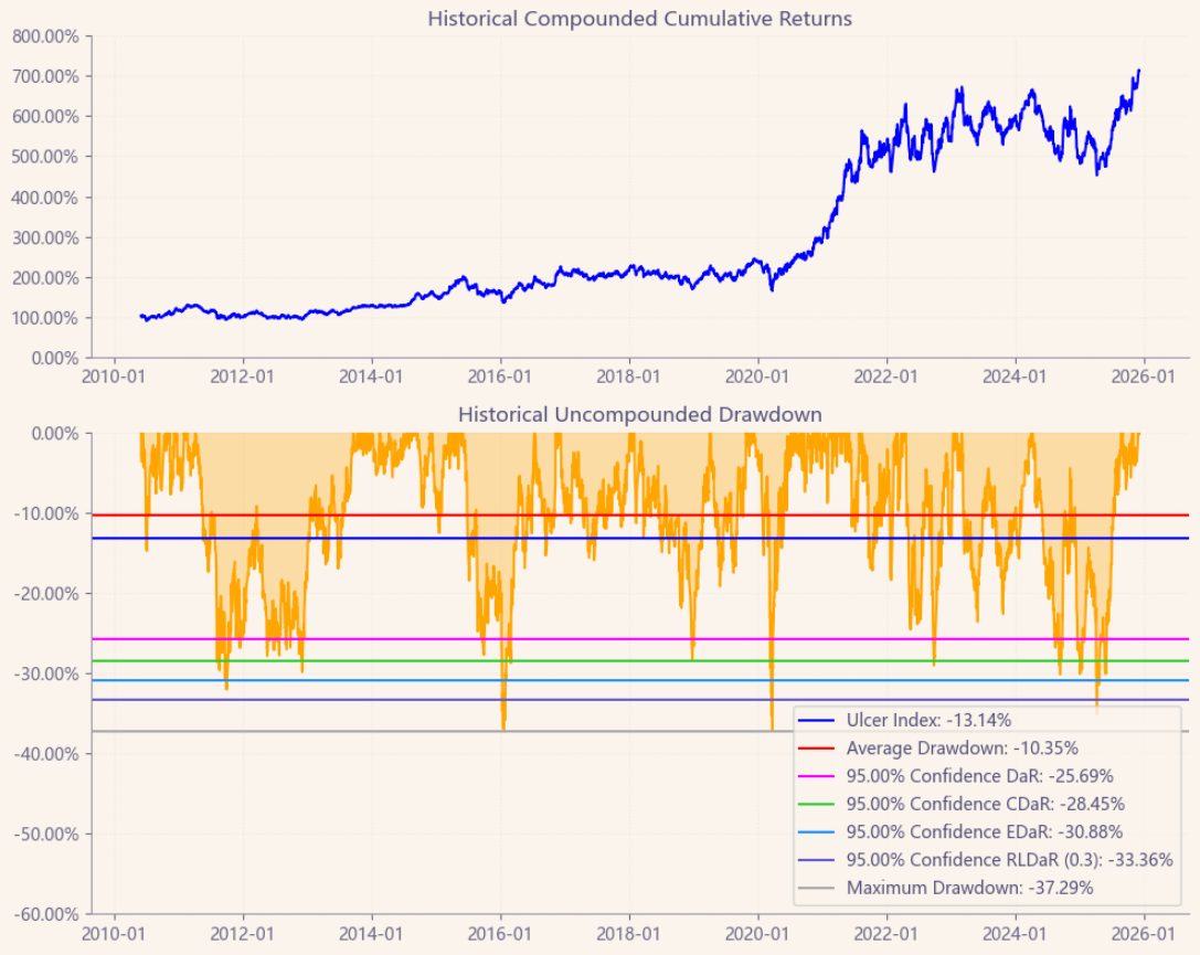 区间累计回报近8倍,最大回撤37.29%,投资组合的整体表现要好于太钢不锈个股。整个钢铁行业盈利能力一般,波动中高,夏普比率0.69令人失望。(Cumulative Returns;Maximum Drawdown)
