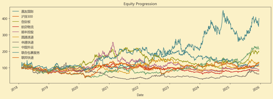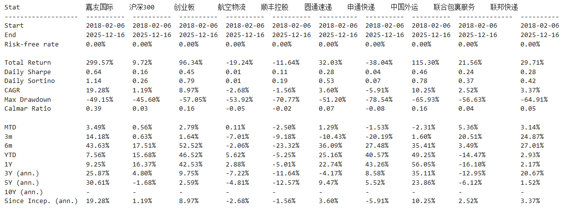 嘉友国际,基本面很稳健,历史表现可圈可点,目前估值中高,只能当配置。整个航空物流行业历史表现略显平庸,波动也偏大,综合夏普比率毫无吸引力,不建议关注,如果一定要配置的话,可以看看嘉友国际、中国外运。