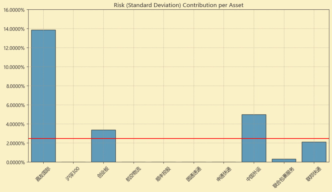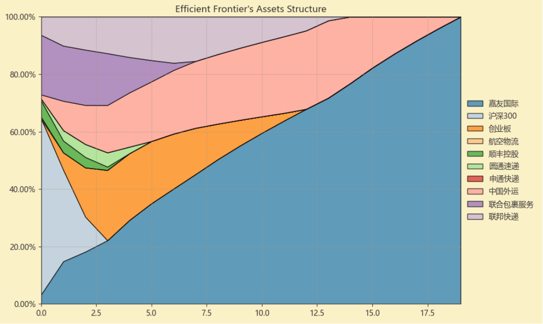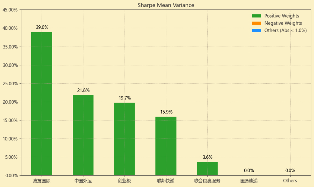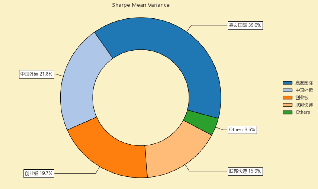 按最高夏普比率配置的话,系统给的权重为39.0%,第二权重给了中国外运占比21.8%。