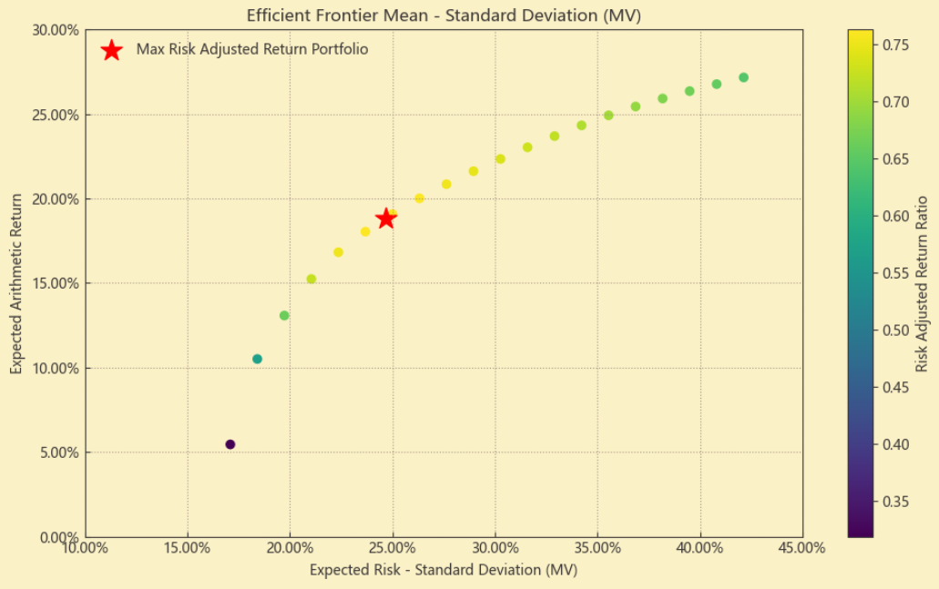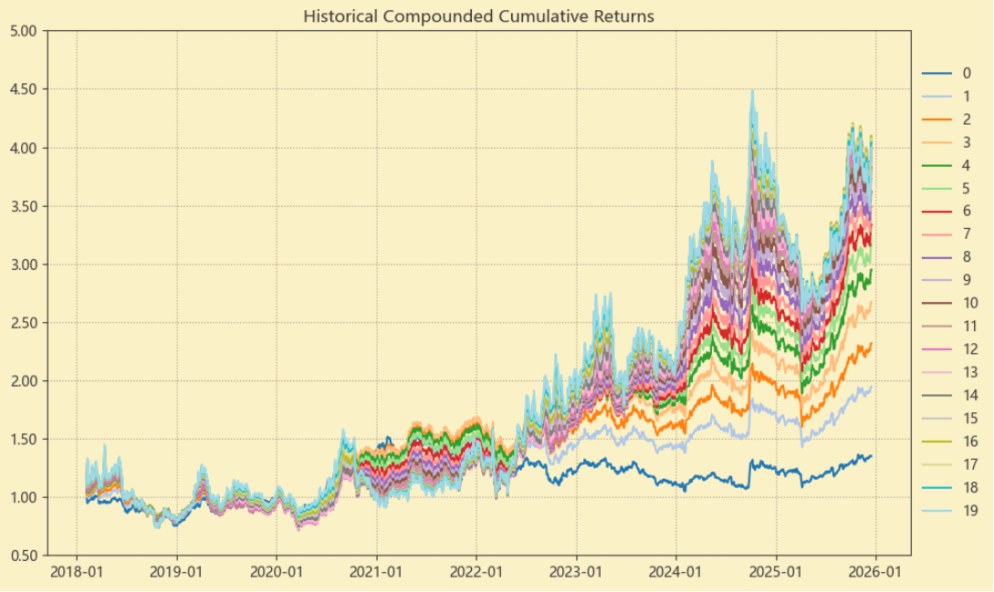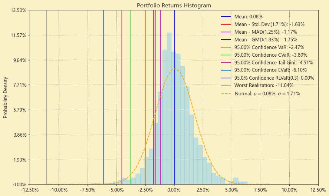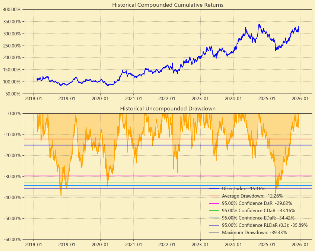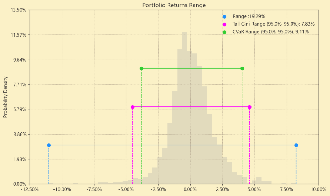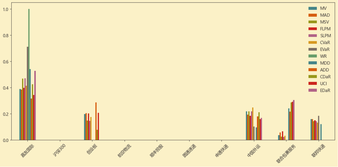 最后看下整个投资组合的情况,日度均值回报在0.08%,比上次测的商品化工行业低40%,相应地9.11%的CVaR波动也会小一些。(Mean;CVaR)