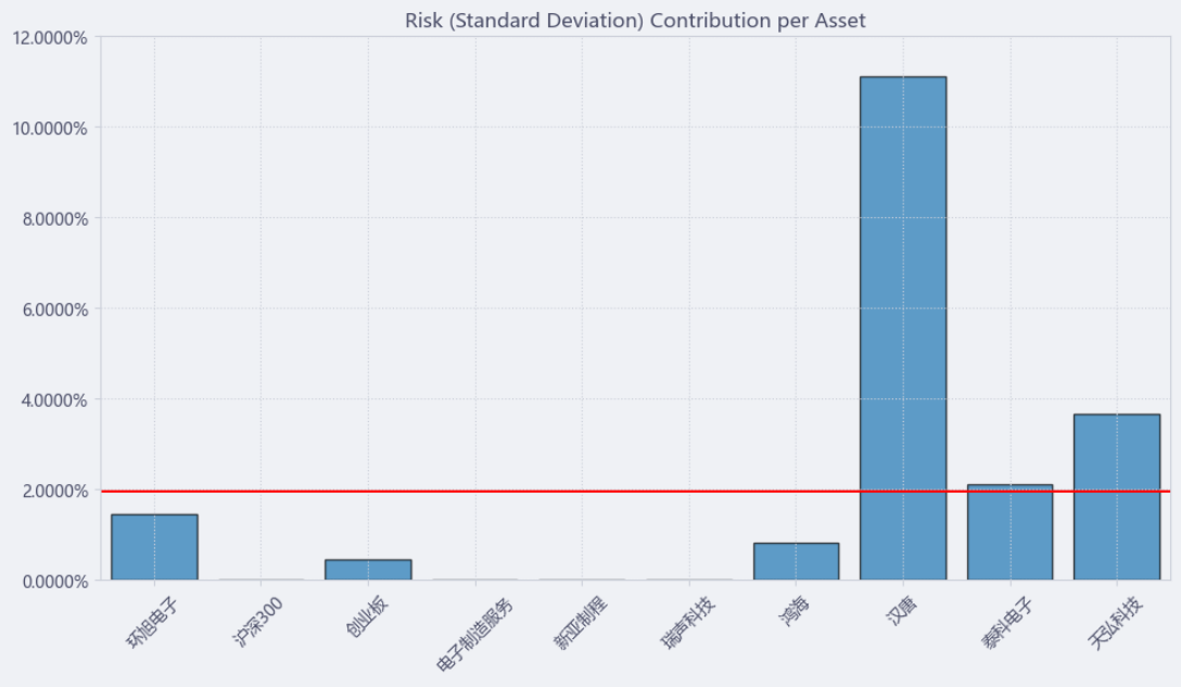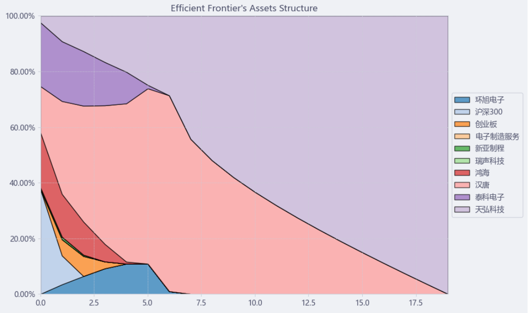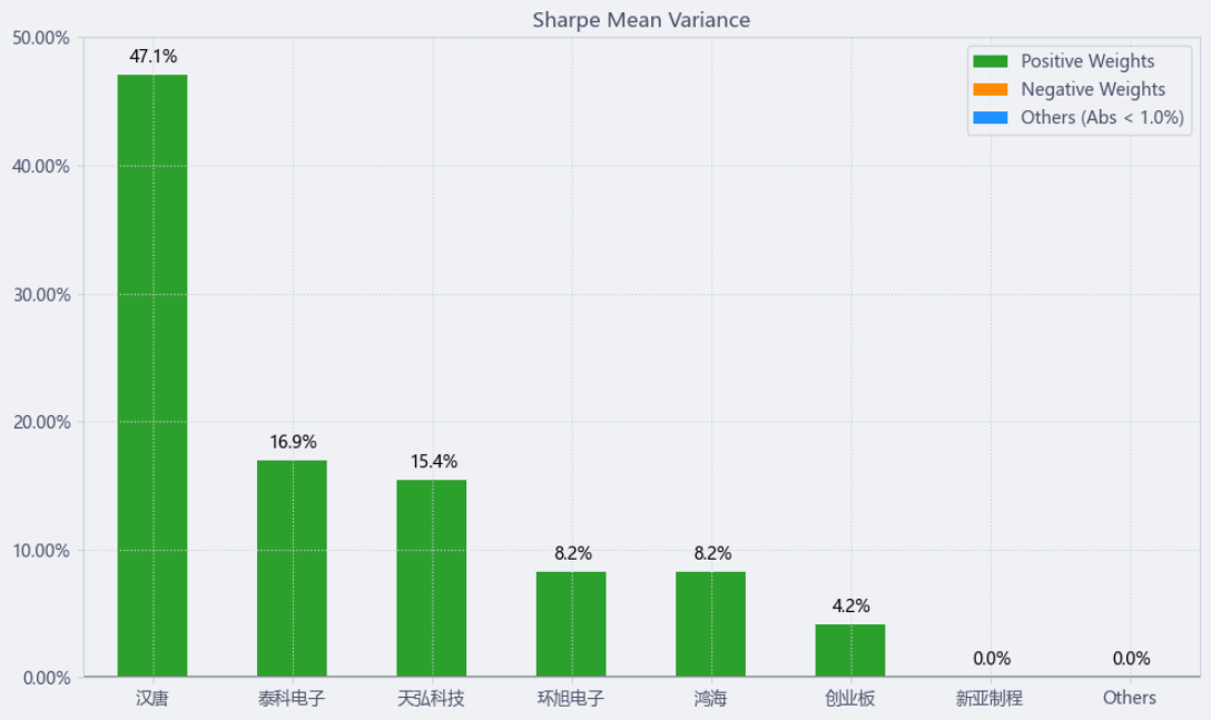按最高夏普比率配置的话,系统给的权重为8.2%,最高权重给了汉唐占比47.1%。