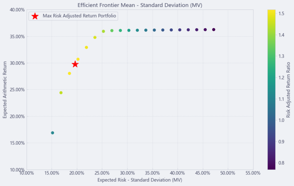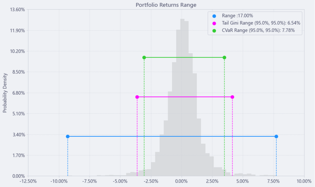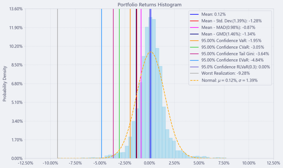 最后看下整个投资组合的情况,日度均值回报在0.12%,比上次测的汽车配件行业高30%,而且7.78%的CVaR波动反而还更小。(Mean;CVaR)