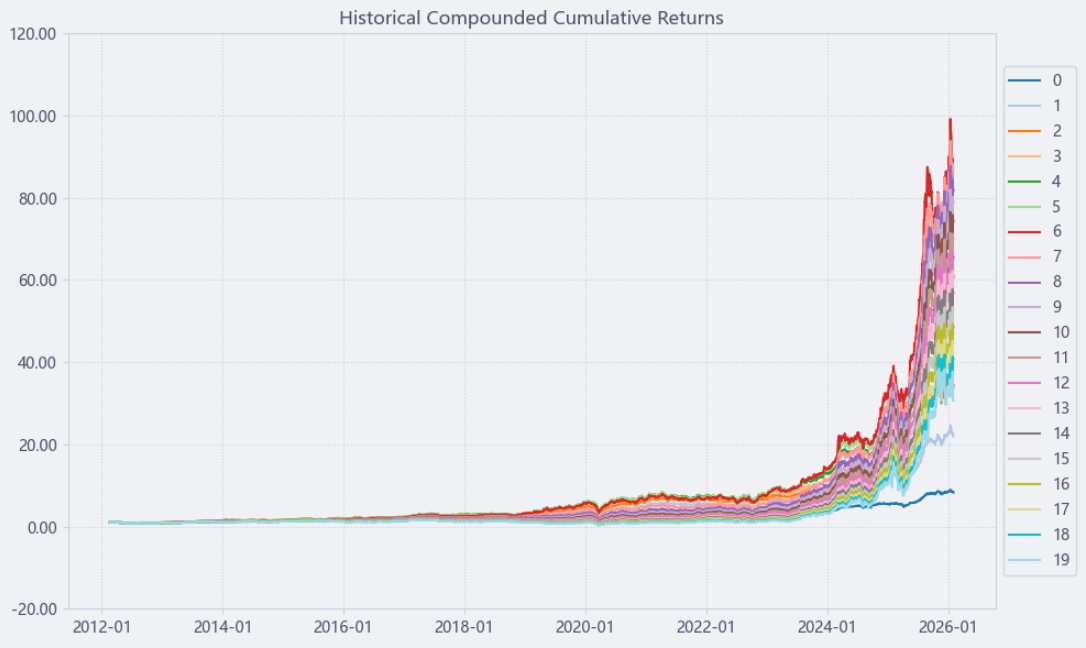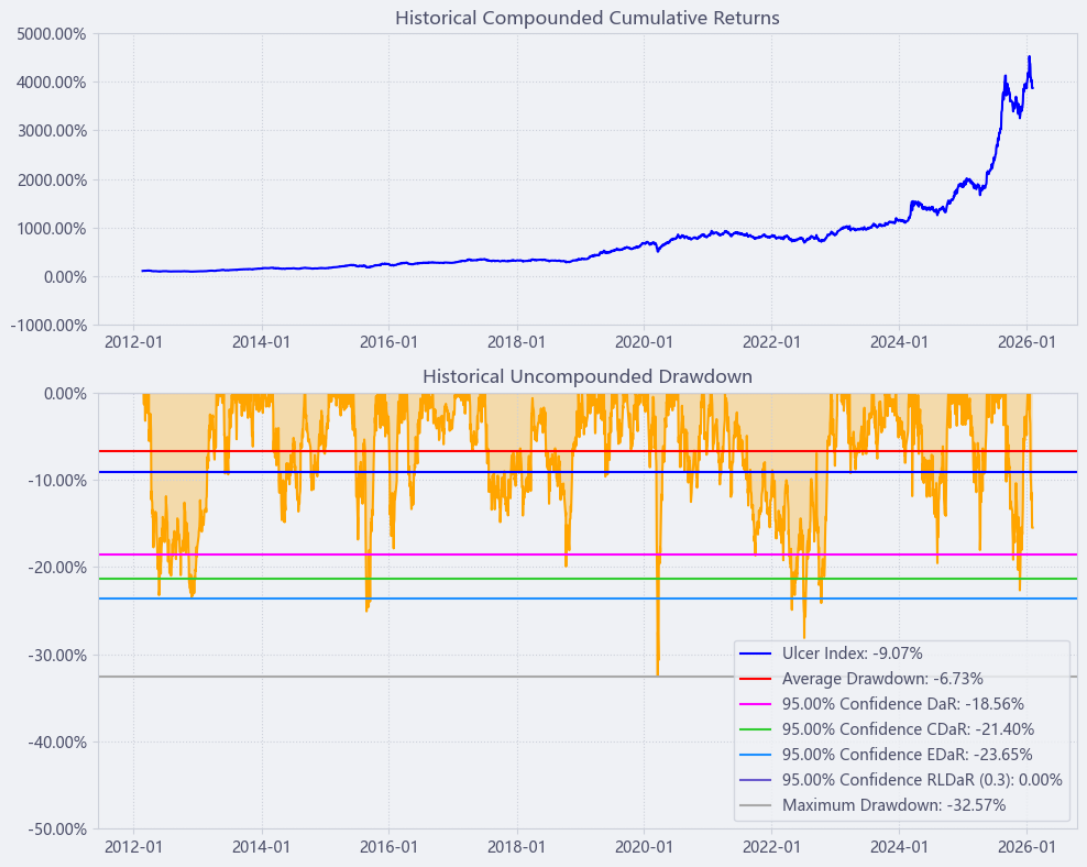 区间累计回报近50倍,最大回撤32.57%,投资组合的整体表现要好于环旭电子个股。整个电子制造服务行业盈利能力不俗,波动中低,夏普比率1.52堪称卓越。(Cumulative Returns;Maximum Drawdown)