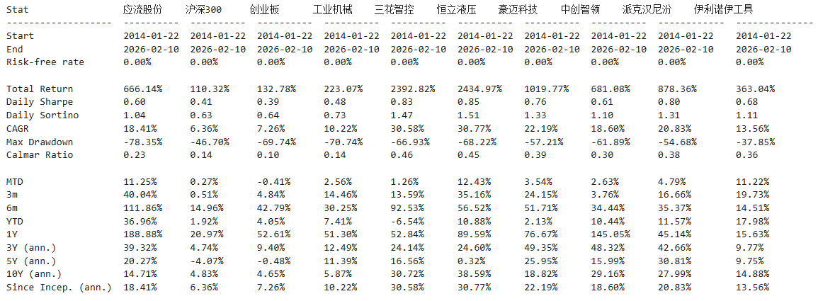 区间累计回报近16倍,最大回撤35.62%,投资组合的整体表现要好于应流股份个股。整个工业机械行业盈利能力不俗,波动也低,夏普比率1.31堪称卓越。(Cumulative Returns;Maximum Drawdown)