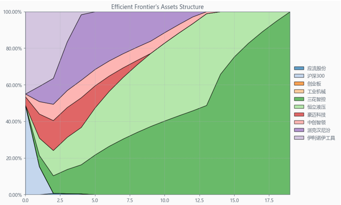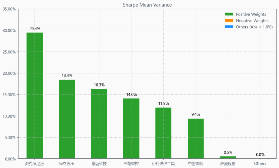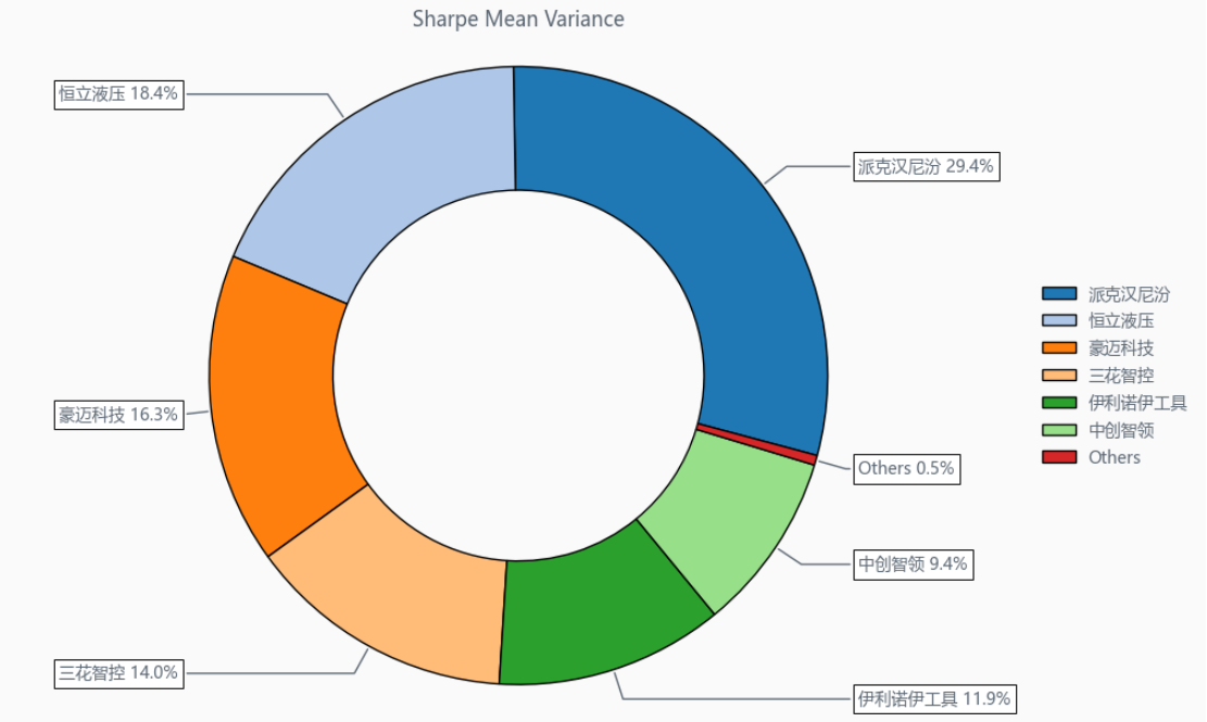 按最高夏普比率配置的话,系统给的权重为0.5%,最高权重给了派克汉尼汾占比29.4%。