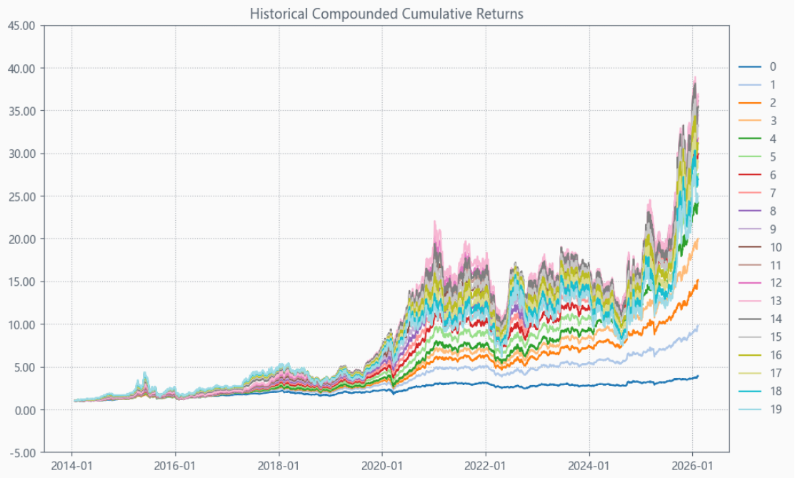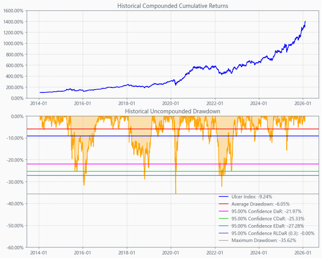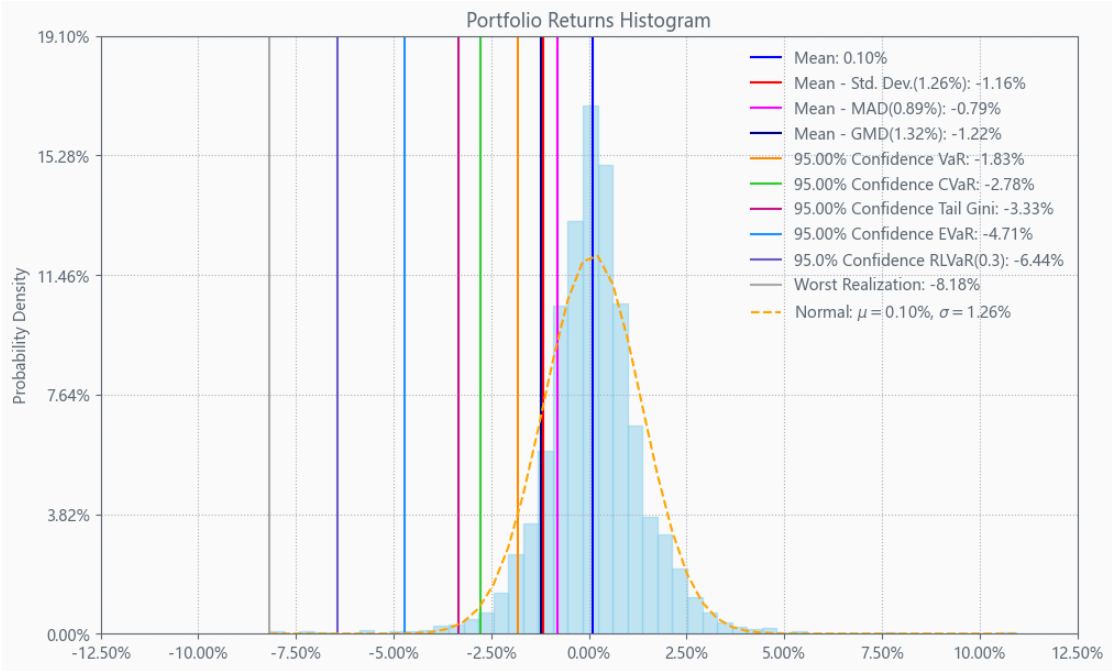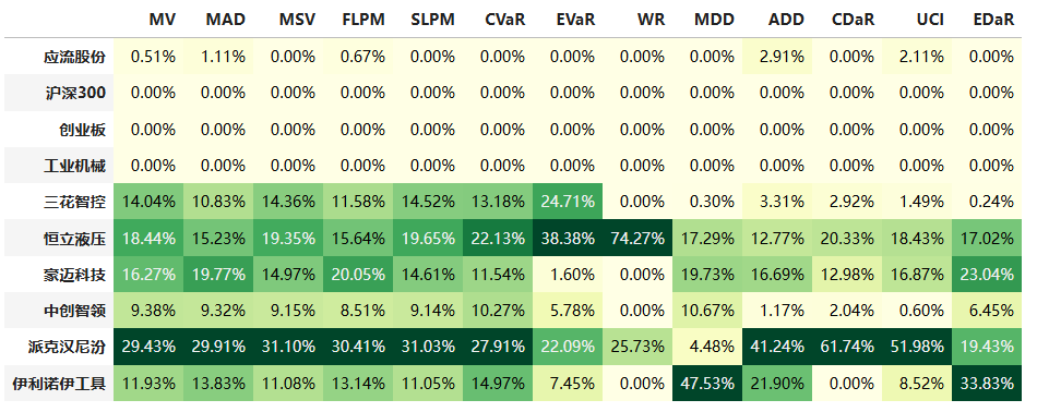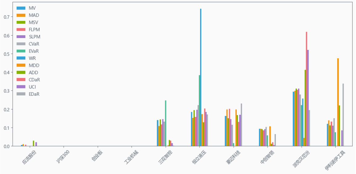 最后看下整个投资组合的情况,日度均值回报在0.10%,比上次测的西药行业高10%,相应地5.71%的CVaR波动也会大一些。(Mean;CVaR)