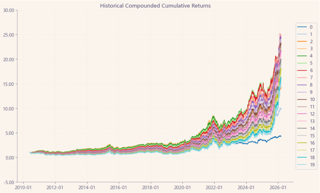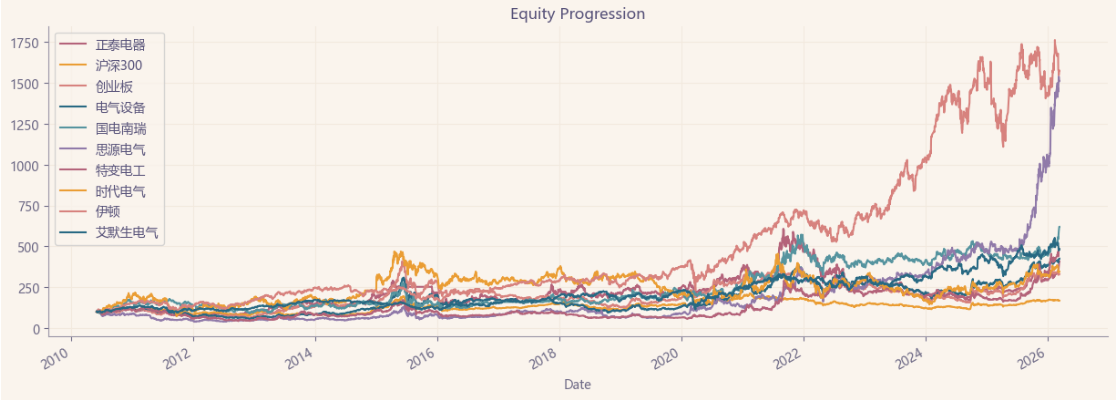 区间累计回报近25倍,最大回撤44.44%,投资组合的整体表现要好于正泰电器个股。整个电气设备行业盈利能力优良,波动中低,夏普比率1.01还算优秀。(Cumulative Returns;Maximum Drawdown)