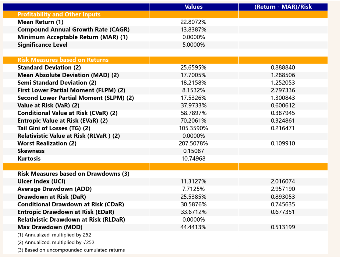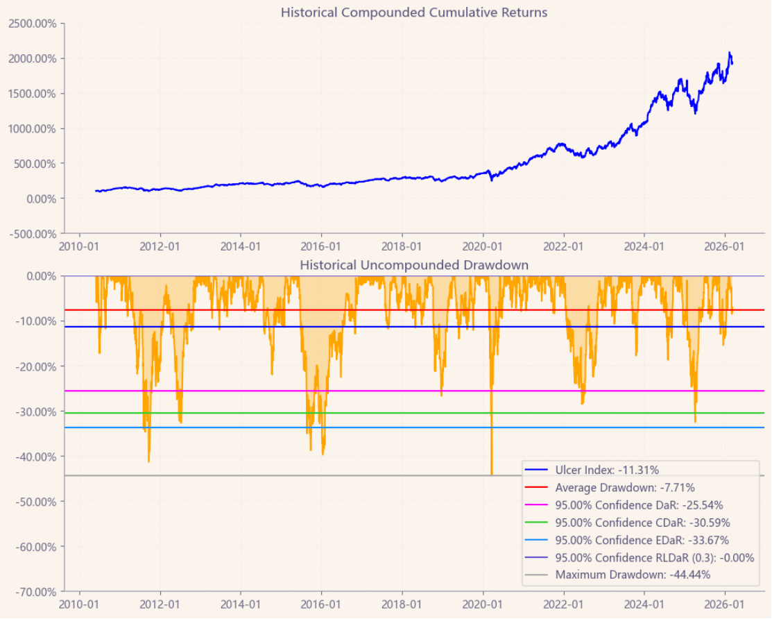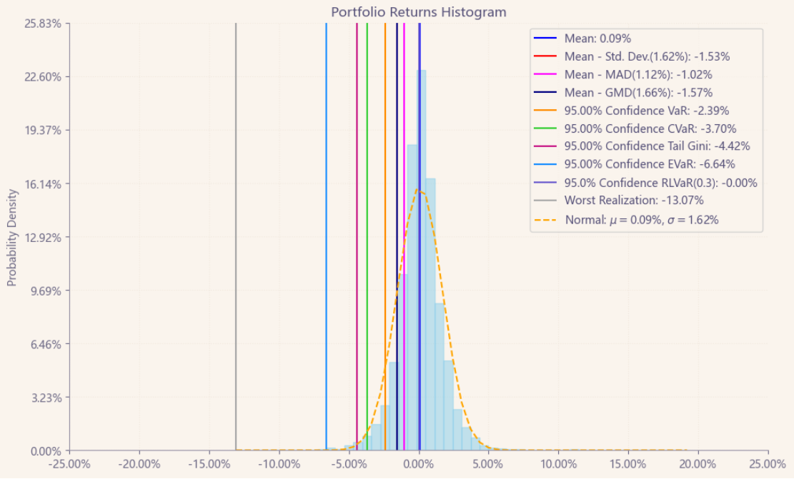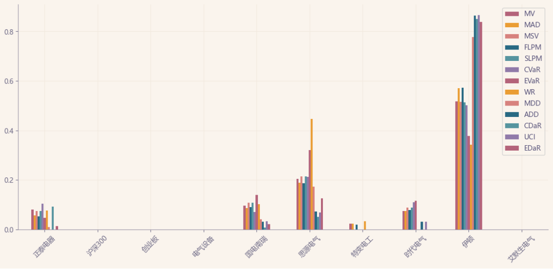 最后看下整个投资组合的情况,日度均值回报在0.09%,与上次测的商品化工行业差不多,不过7.40%的CVaR波动会大一些。(Mean;CVaR)
