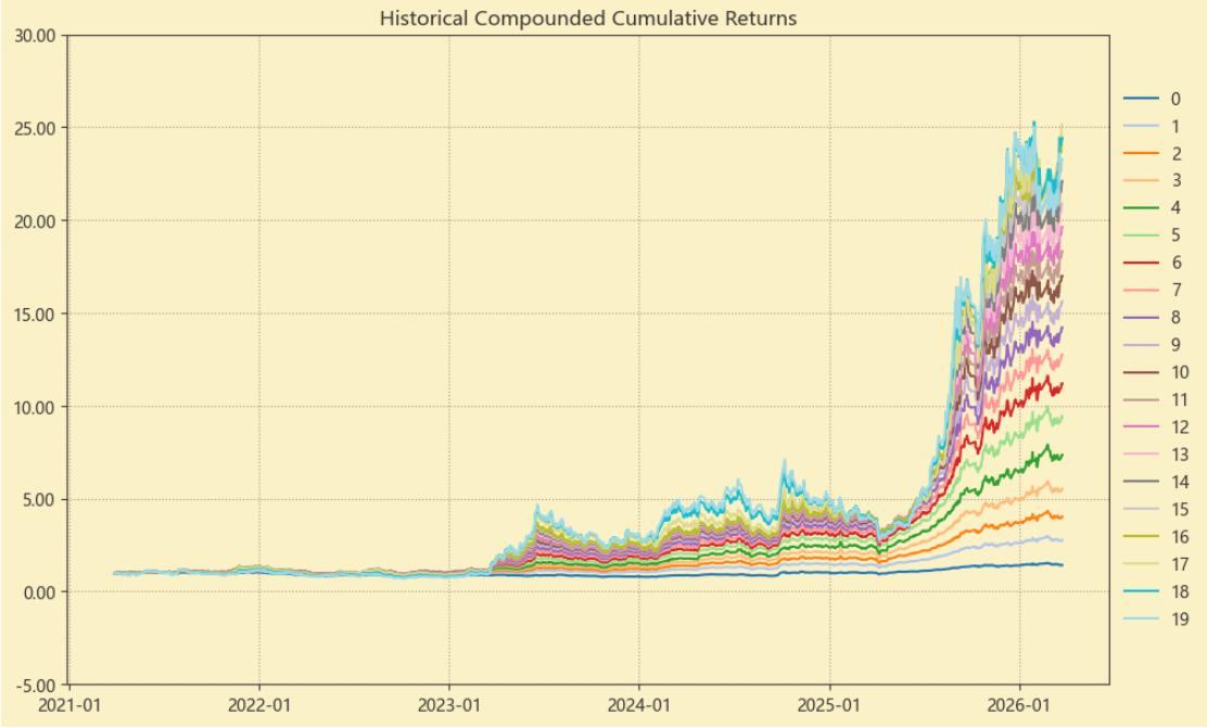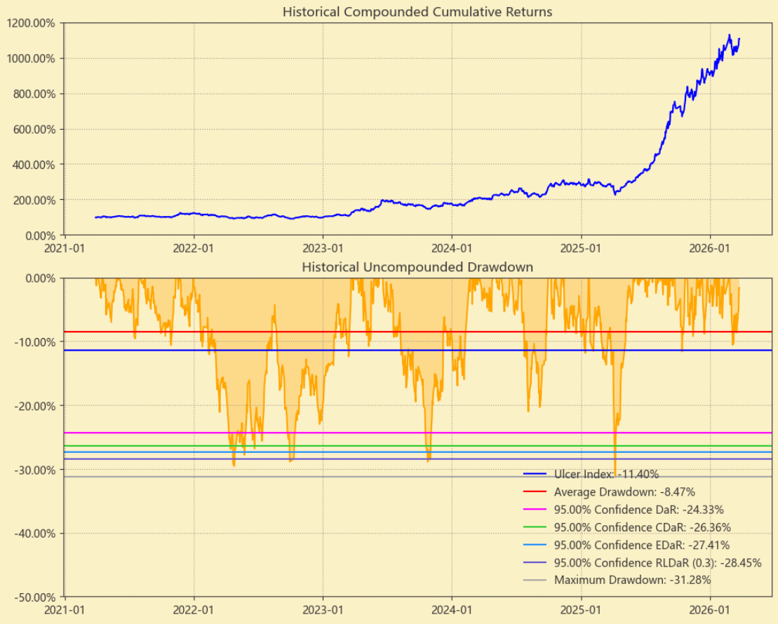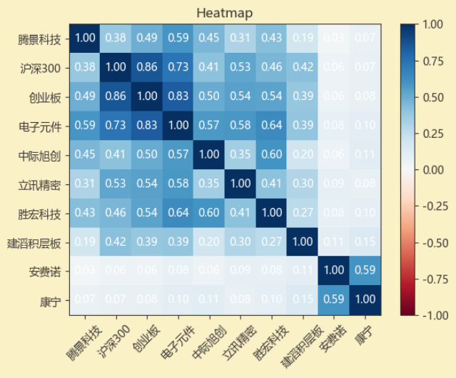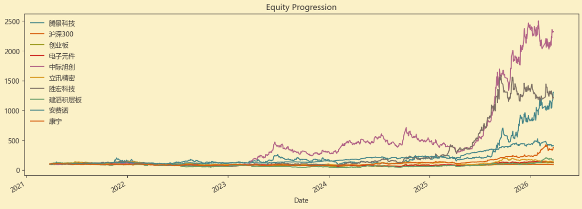 区间累计回报近12倍,最大回撤31.28%,投资组合的整体表现要好于腾景科技个股。整个电子元件行业盈利能力优异,波动中等,夏普比率1.82堪称卓越。(Cumulative Returns;Maximum Drawdown)