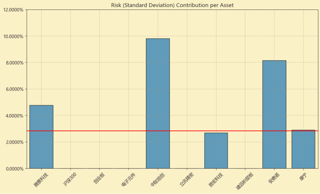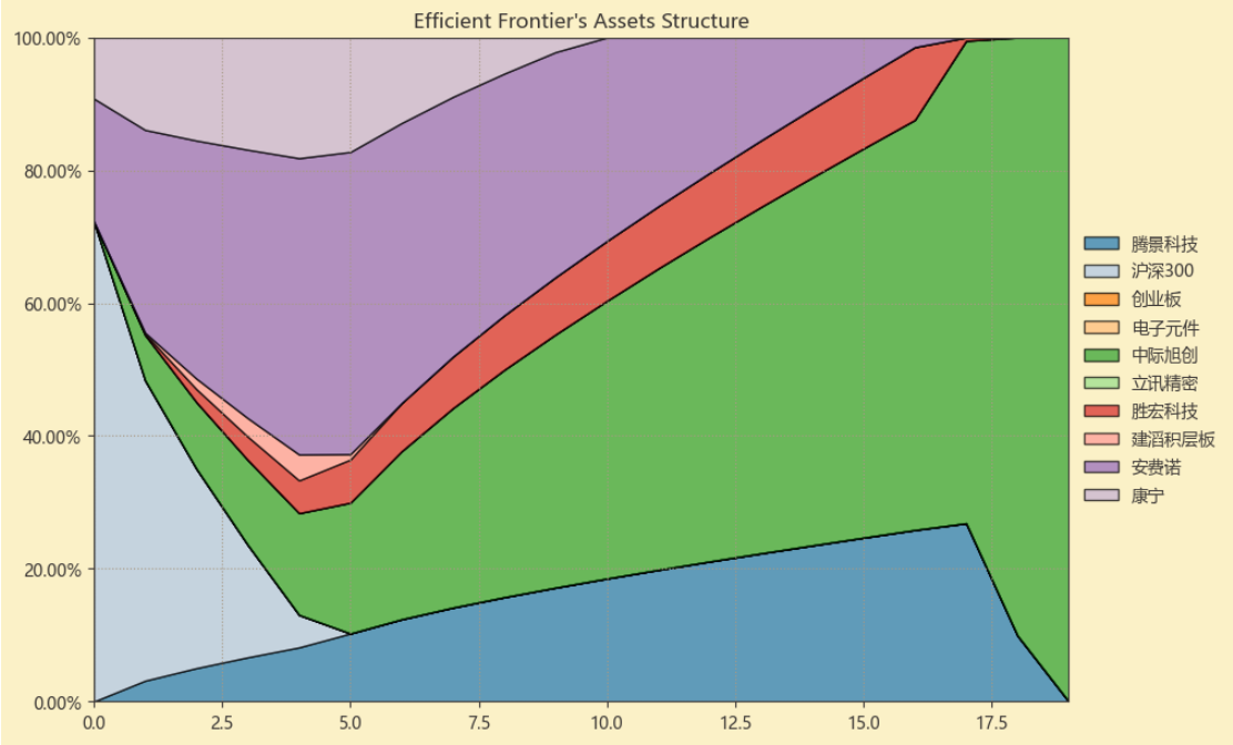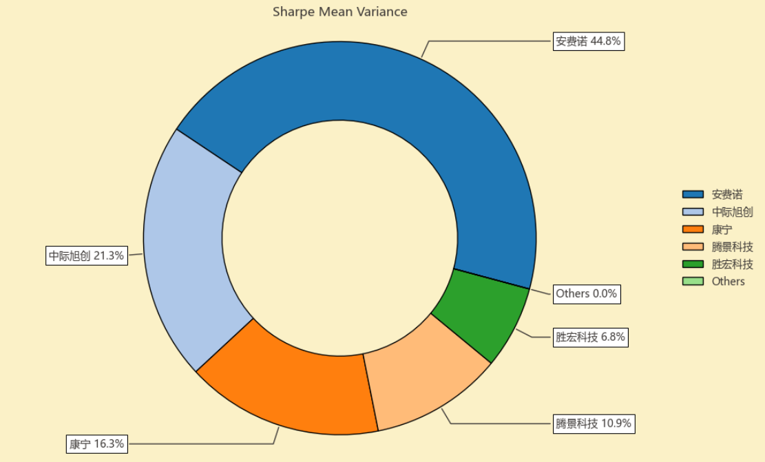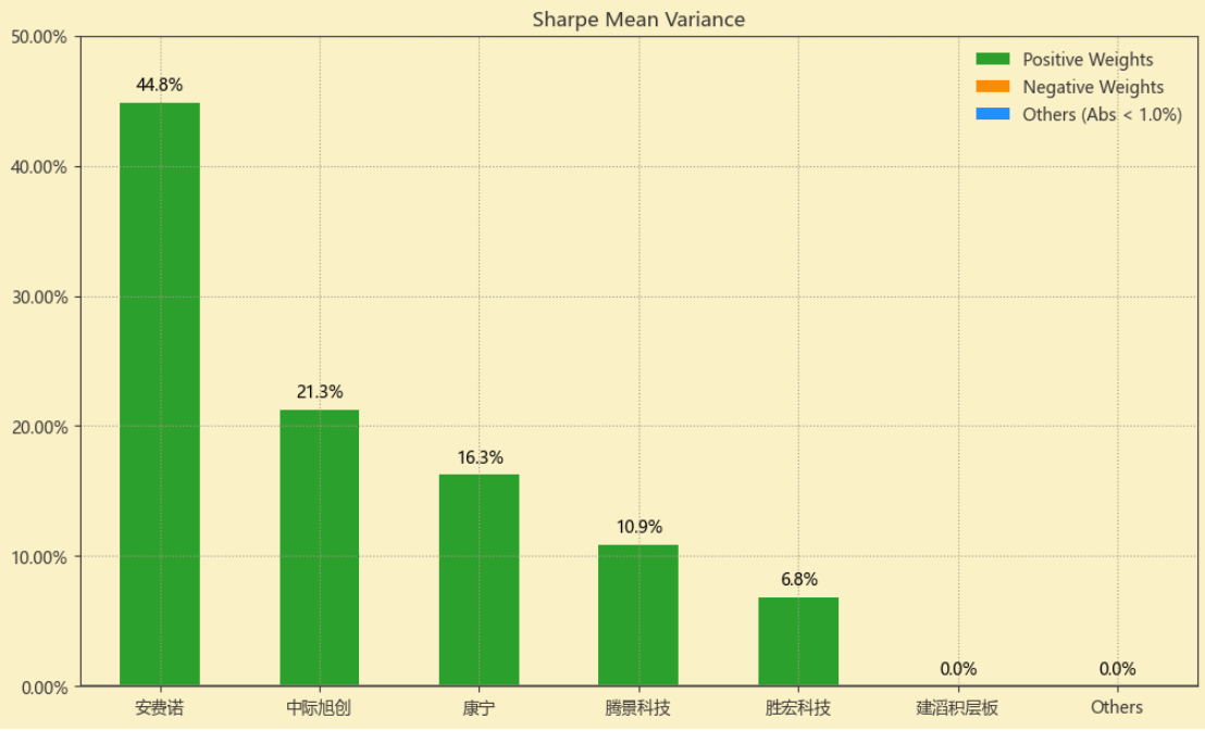按最高夏普比率配置的话,系统给的权重为10.9%,最高权重给了安费诺占比44.8%。