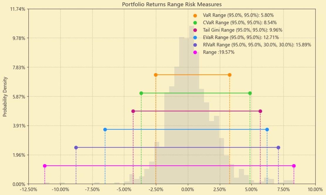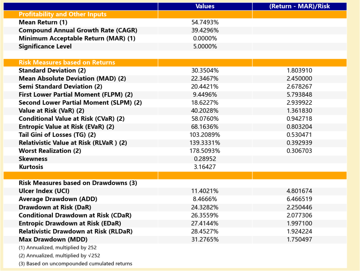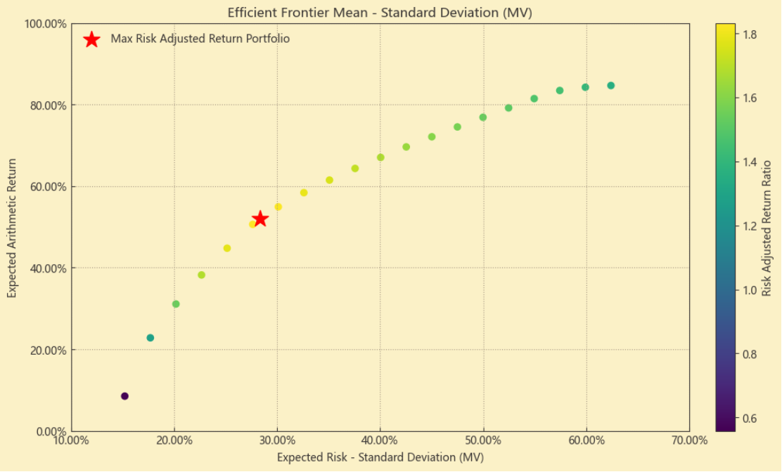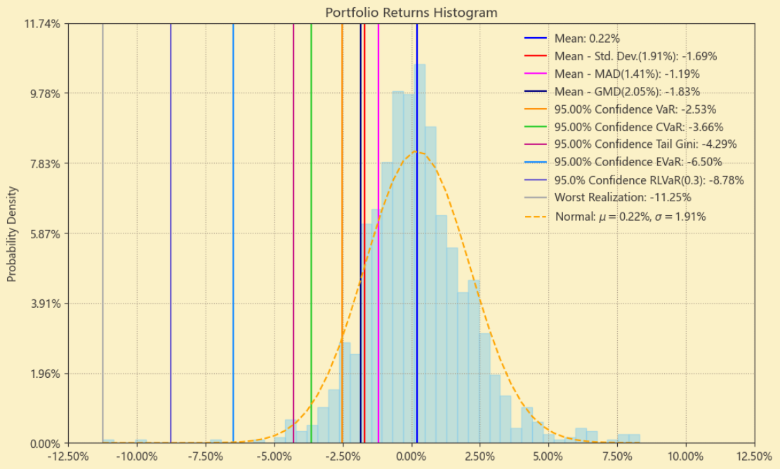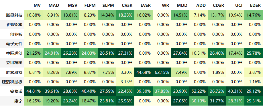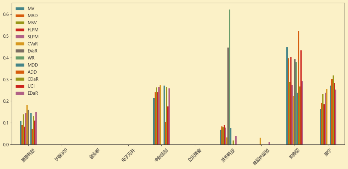最后看下整个投资组合的情况,日度均值回报在0.22%,比上次测的汽车配件行业高140%,而且8.54%的CVaR波动反而还更小。(Mean;CVaR)