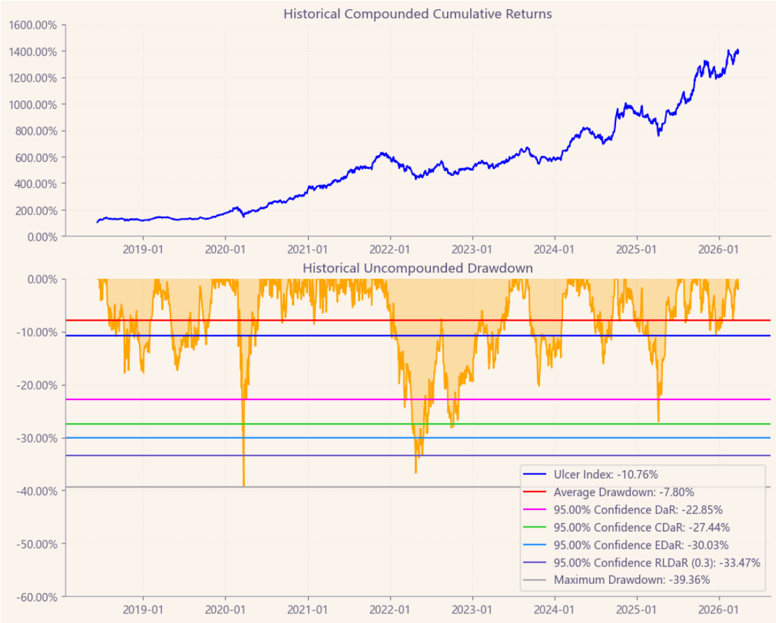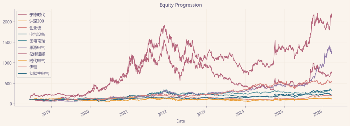 区间累计回报近16倍,最大回撤39.36%,投资组合的整体表现要好于宁德时代个股。整个电气设备行业盈利能力优异,波动中低,夏普比率1.52堪称卓越。(Cumulative Returns;Maximum Drawdown)