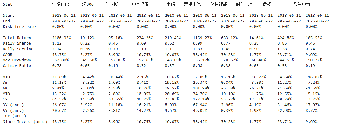 整个电气设备行业历史表现不俗,波动尚可,综合夏普比率极具竞争力,值得重点关注,可以看看宁德时代、伊顿。就个股而言,宁德时代,基本面稳健,历史表现一骑绝尘,目前估值不高,综合指数五颗星⭐⭐⭐⭐⭐。(星级从一到五排序,星级越高越好)