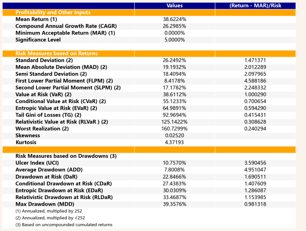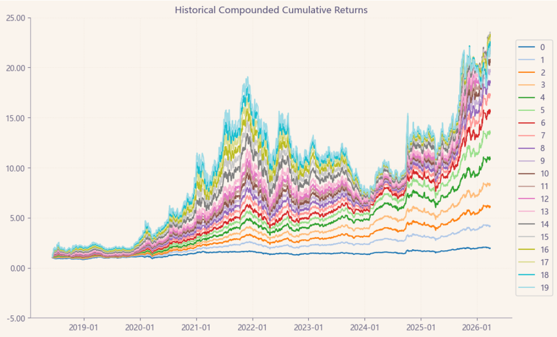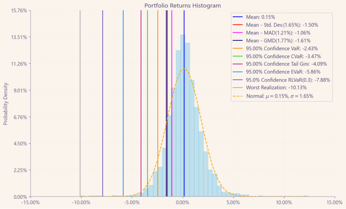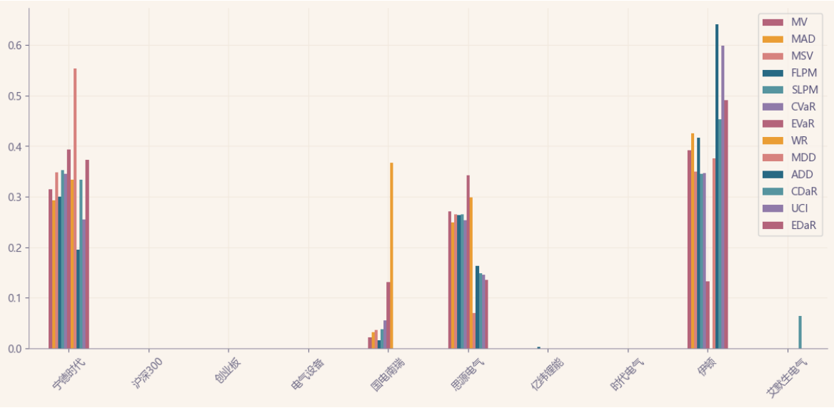 最后看下整个投资组合的情况,日度均值回报在0.15%,比上次测的金属非金属行业高50%,而且7.36%的CVaR波动反而还更小。(Mean;CVaR)