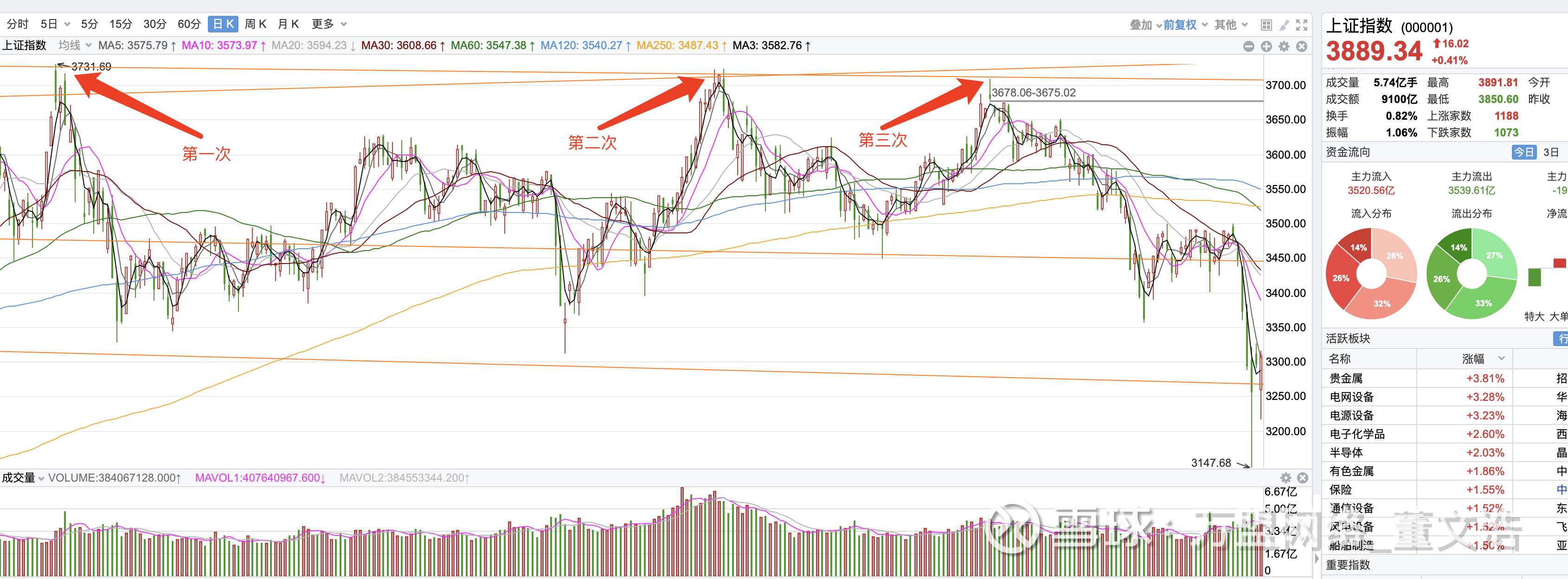 个股如此,大盘亦如此。大家可以看一下上证指数在2021年3次试图突破3700点时的线型。第三次上冲失败后,迎来了2022-2024年中的惨烈下跌。如下图。