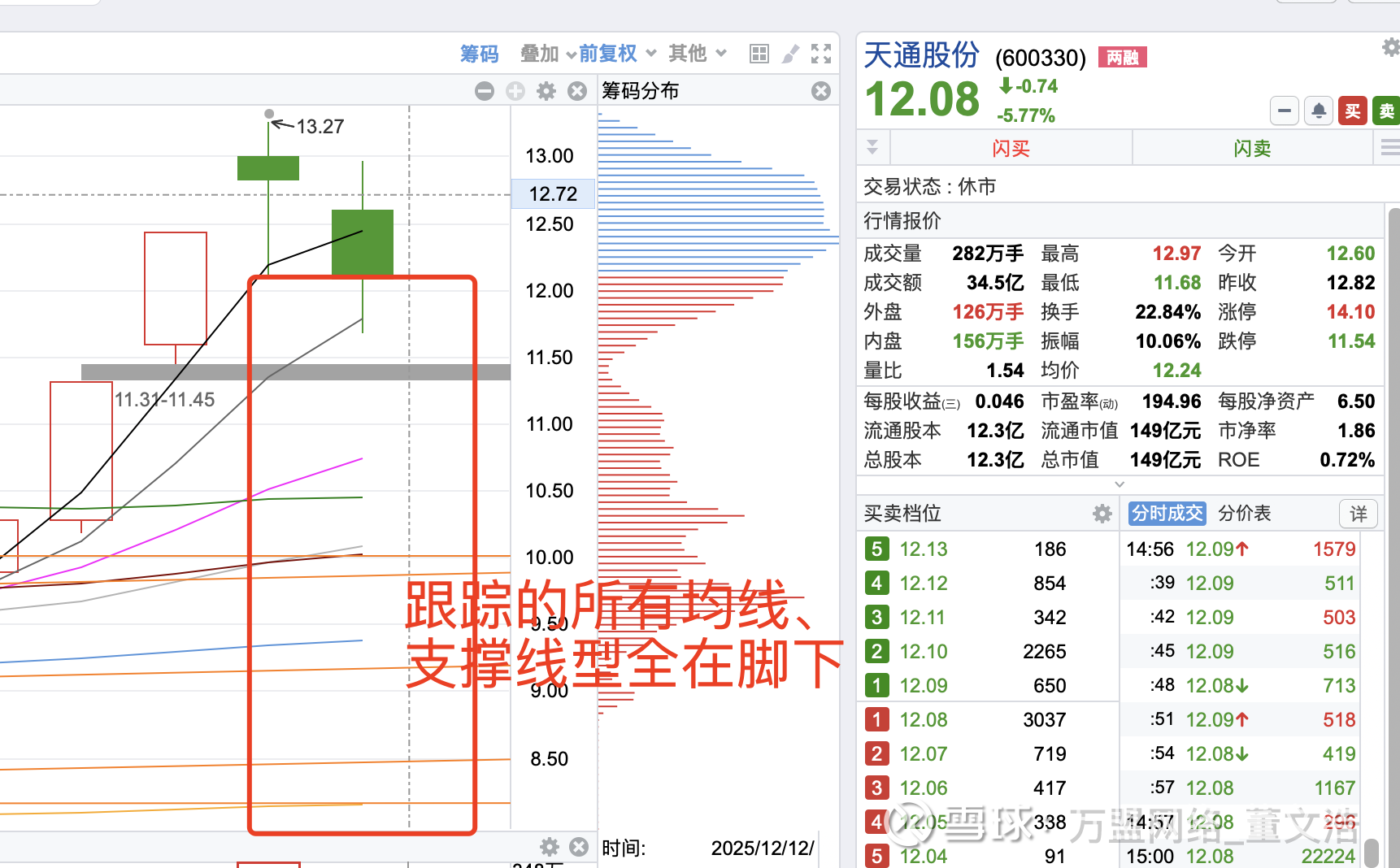 而当下的天通股份,正是第三次寻求上冲13元价格带的关键时刻,并且在11、12两天呈现出高位巨量震荡、换手的强势整理形态。所以,正如我的标题——15日,下周一就是天通股份的决胜之日。这一天,即决胜负,也定生死。