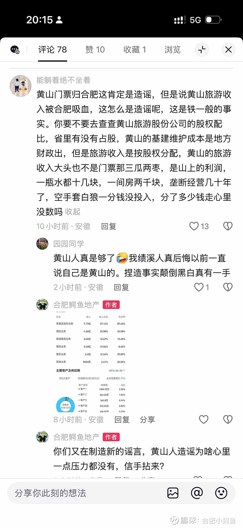 个别人造谣真是张口就来。我指出黄山门票被合肥吸走是谣言,有人随即改口称合肥吸走了黄山的住宿收入。我拿出黄山旅游的财报说明,住宿是其核心收入,对方又转而说合肥掌控了股权。当我公示了上市公司股权明细后,这些人便不再作声。造谣者毫无底线,换着花样歪曲事实,实在令人不齿。