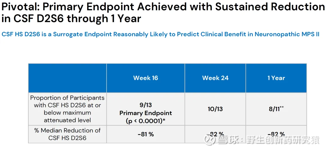 从治疗数据来看,在Pivotal研究中主要研究终点第16周、第24周、第52周的时候脑脊液中HS D2S6 水平降到最大衰减阈值以下的患者比例分别是9/13(约69.2%)、10/13(约76.9%)、8/11(约72.7%),脑脊液中HS D2S6 水平下降81%、82%、82%。
