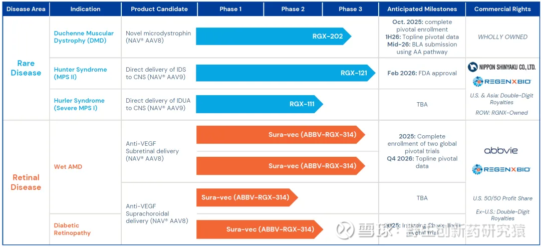 Regenxbio目前聚焦在基因疗法领域,目前有3个产品。有望最早获批上市的是AAV基因疗法RGX-121(递送人艾杜糖醛酸-2-硫酸酯酶IDS至CNS),PDUFA日期是 2026年2月8日;第2个产品是AAV基因疗法RGX-202(递送微抗肌萎缩蛋白)预计26Q2读出杜氏肌营养不良症(DMD)关键顶线数据,并于年中提交BLA申请;第3个产品AAV基因疗法Sura-vec /ABBV-RGX-314(递送VEGF)预计26Q4读出wAMD适应症3期数据。