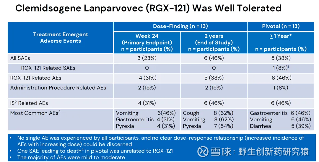 安全性方面,虽然AAV基因疗法安全性一直是个问题,但因为 RGX-121 不是静脉注射而是通过鞘内注射给药,所以安全性相对还不错。