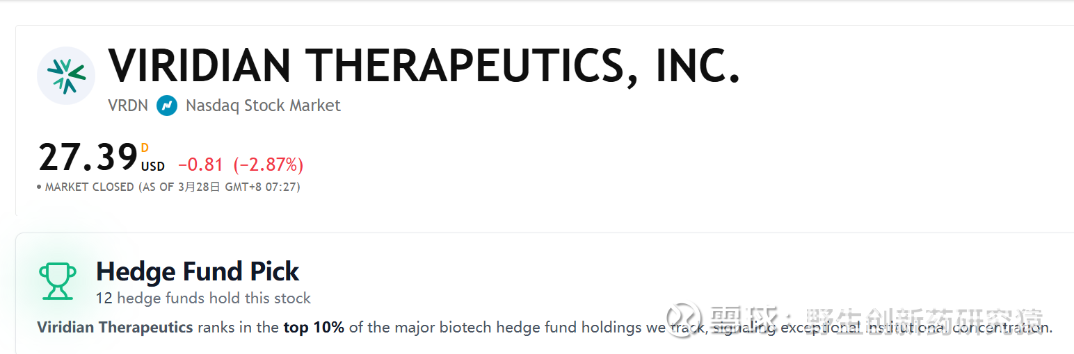 $Viridian(VRDN)$ 最近看有公众号推VRDN,看了下感觉值得赌一赌,今年催化蛮多的,看了下BPIQ也给了“Hedge Fund Pick”的标签。近期催化是VRDN-003/elegrobart(皮下)REVEAL-1 active TED 3期 topline数据读出(Q1读出,成败应该就在这几天??)
