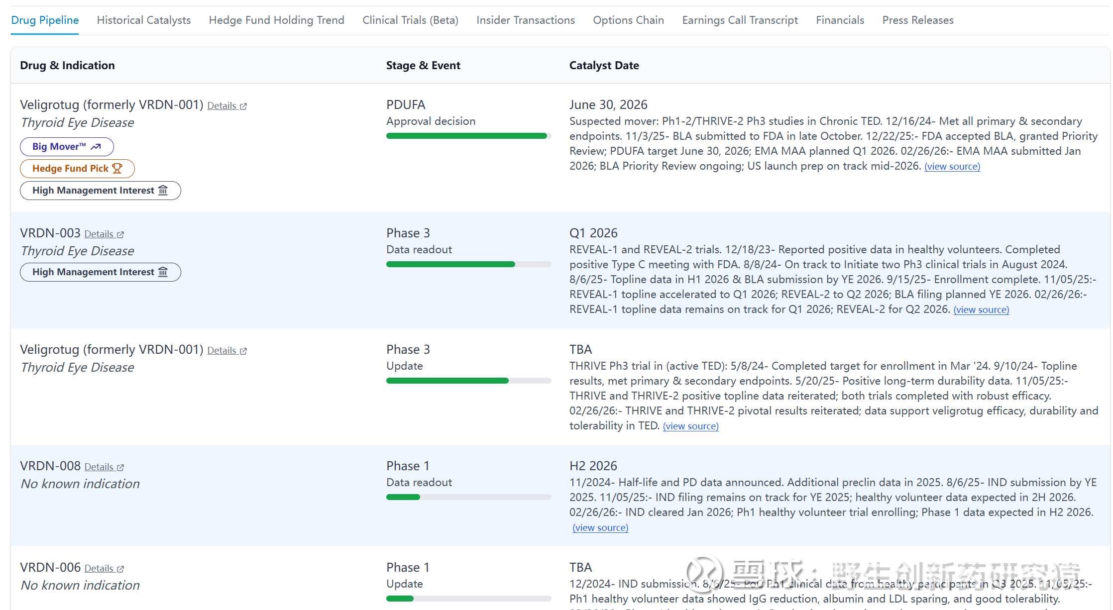 按重要性排序是三件事:第一,VRDN-003/elegrobart(皮下)REVEAL-1 active TED 3期 topline,公司最新公开口径仍是 2026年Q1;第二,REVEAL-2 chronic TED 3期 topline,指引为 2026年Q2;第三,VRDN-001/veligrotug 的 FDA PDUFA,日期是 2026年6月30日。此外,欧洲方面公司已在 2026年1月 提交 veligrotug 的 EMA MAA;更远一点的还有 VRDN-008 健康人数据预计 2026年下半年,以及 TSHR 项目 IND 预计 2026年Q4。