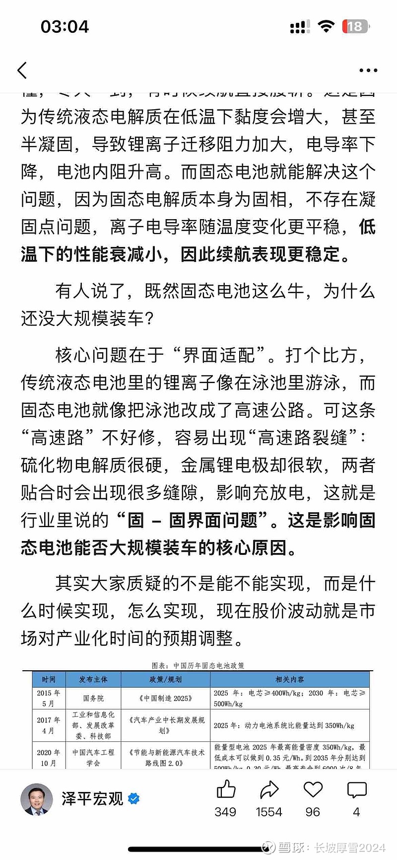 泽平宏观:固态电池是技术革命,目前产业核心卡点是 “固 - 固界面问题”。这是影响固态电池能否大规模装车的核心原因。也是长阳的固态电解质薄膜直接要解决的问题。