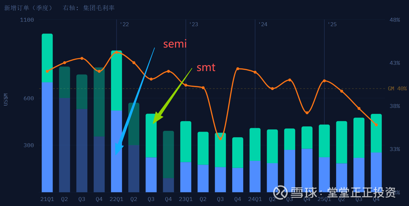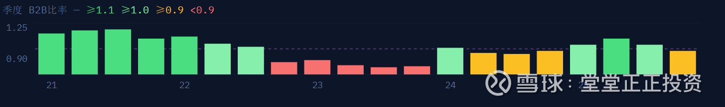 订付比(Book-to-Bill)向来是设备股的前瞻指标,与股价高度相关。全年1.05创近年新高,理论上应该对应更积极的市场定价。但如果拆解到季度,Q4环比其实是走弱的——这里产生了一些背离。