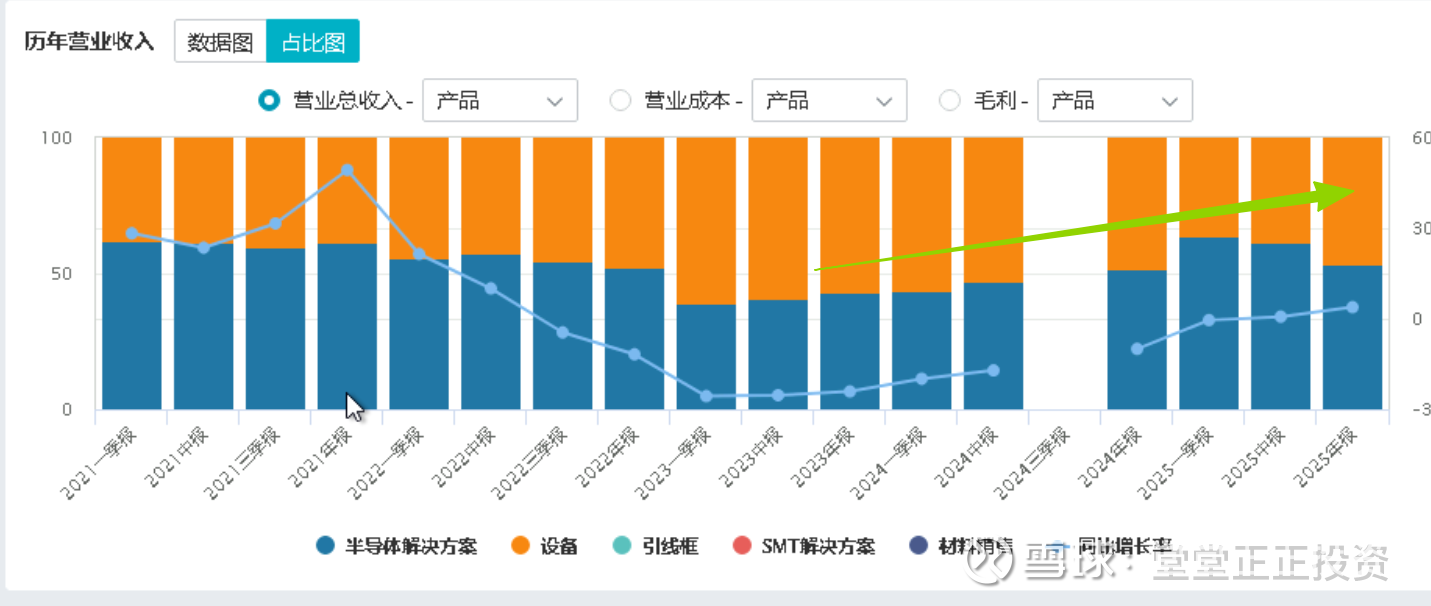 结构分化明显 从营收结构看,半导体解决方案(SEMI)占比持续提升,先进封装受益于AI资本开支扩张,逻辑无需多言。但传统业务的拖累依然存在。