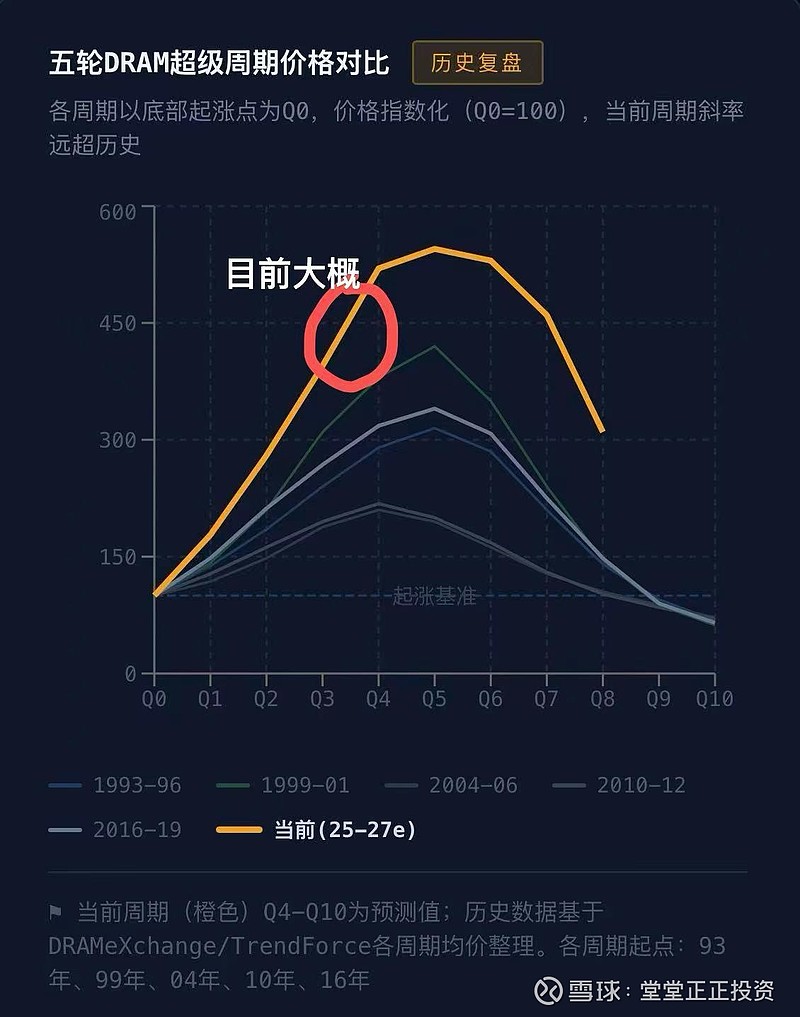 历史上,半导体涨价周期从起点到拐点通常是6-8个季度。本轮涨价实质性启动在2025年Q2-Q3,按这个节奏,拐点窗口在2026年底到2027年中之间。虽然三大厂产能纪律显著增强可能会把周期拉长,我倾向于认为整体拐点大概在2027年Q1-Q3,不会更早,但也不会更晚。