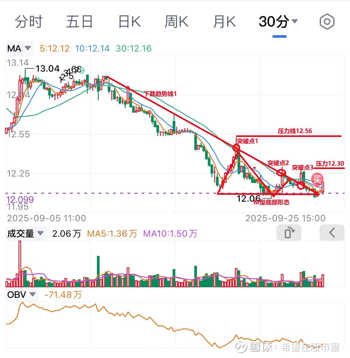 30分钟线:下跌趋势线被突破3次,同时底部形成M底,买入抄底