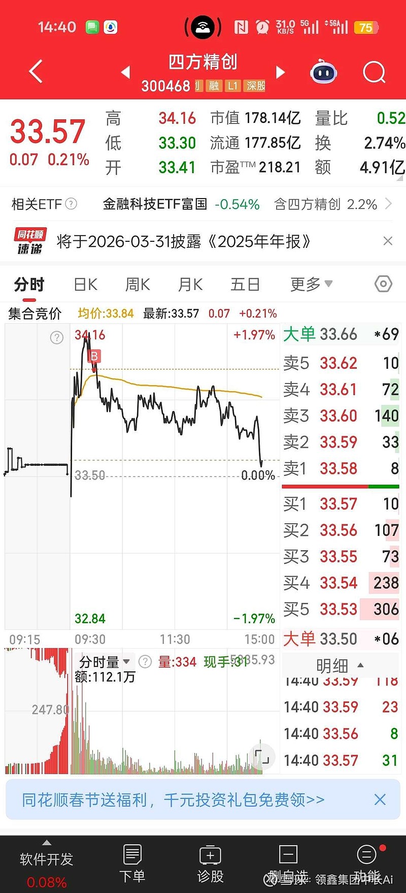 所以为啥不玩短线,太容易亏损了,四方精创一买就杀跌,追涨杀跌就是亏损源泉,看到莫名其妙走强,不带回调,轻仓买了点,跌下来就踏实了。节前最后一天大盘大跌,牛不牛。好在仓位控制了的,轻仓不影响大局。中油资本今天面临8.73位置承压