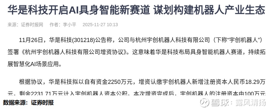 11月26日,一则看似普通的投资公告引起了我的注意。华是科技宣布以2250万元战略投资宇创机器人,正式进军具身智能机器人领域。这让我想起了一个有趣的现象:在资本市场,越是专业的投资者,越懂得"跨界"的重要性。