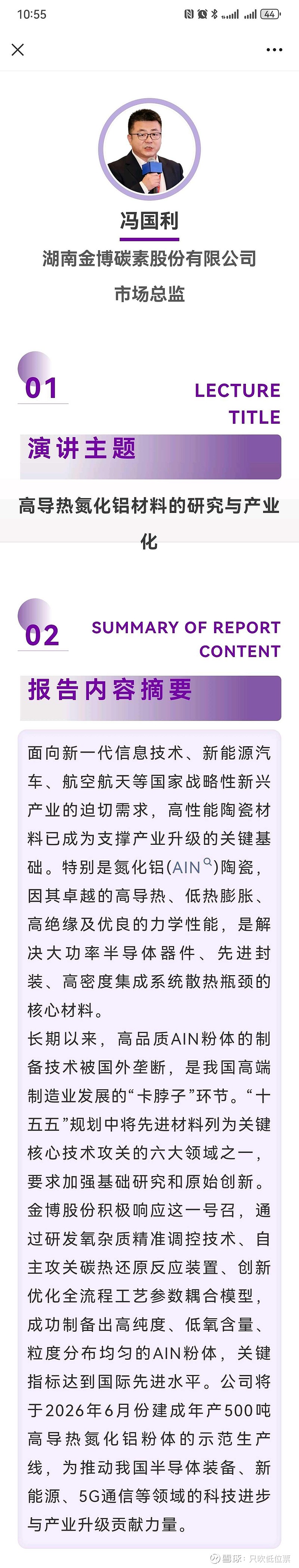 $金博股份(SH688598)$ 3月26日,金博股份新材料领域又一突破.长期以来,高品质AIN粉体的制备技术被国外垄断,是我国高端制造业发展的“卡脖子”环节。“十五五”规划中将先进材料列为关键核心技术攻关的六大领域之一,要求加强基础研究和原始创新。金博股份积极响应这一号召,通过研发氧杂质精准调控技术、自主攻关碳热还原反应装置、创新优化全流程工艺参数耦合模型,成功制备出高纯度、低氧含量、粒度分布均匀的AIN粉体,关键指标达到国际先进水平。公司将于2026年6月份建成年产500吨高导热氮化铝粉体的示范生产线,为推动我国半导体装备、新能源、5G通信等领域的科技进步与产业升级贡献力量。
