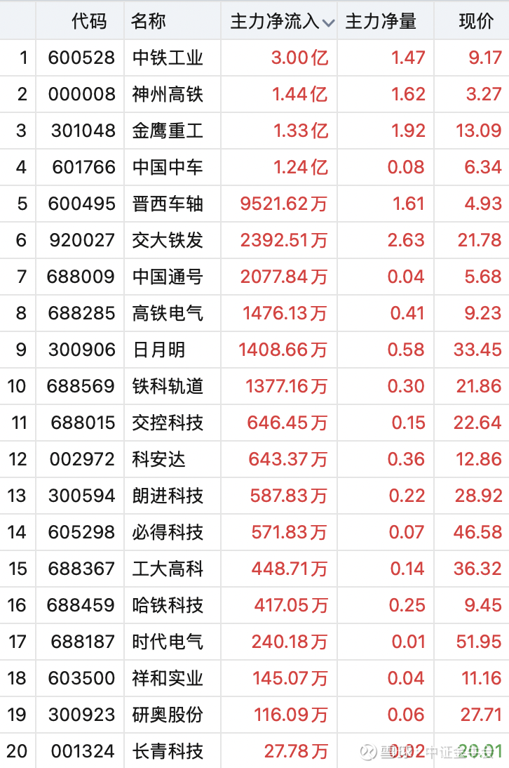 个股方面,中铁工业净流入3.0亿元,居板块第一,神州高铁净流入1.44亿元,金鹰重工、中国中车均获超1亿元资金介入。