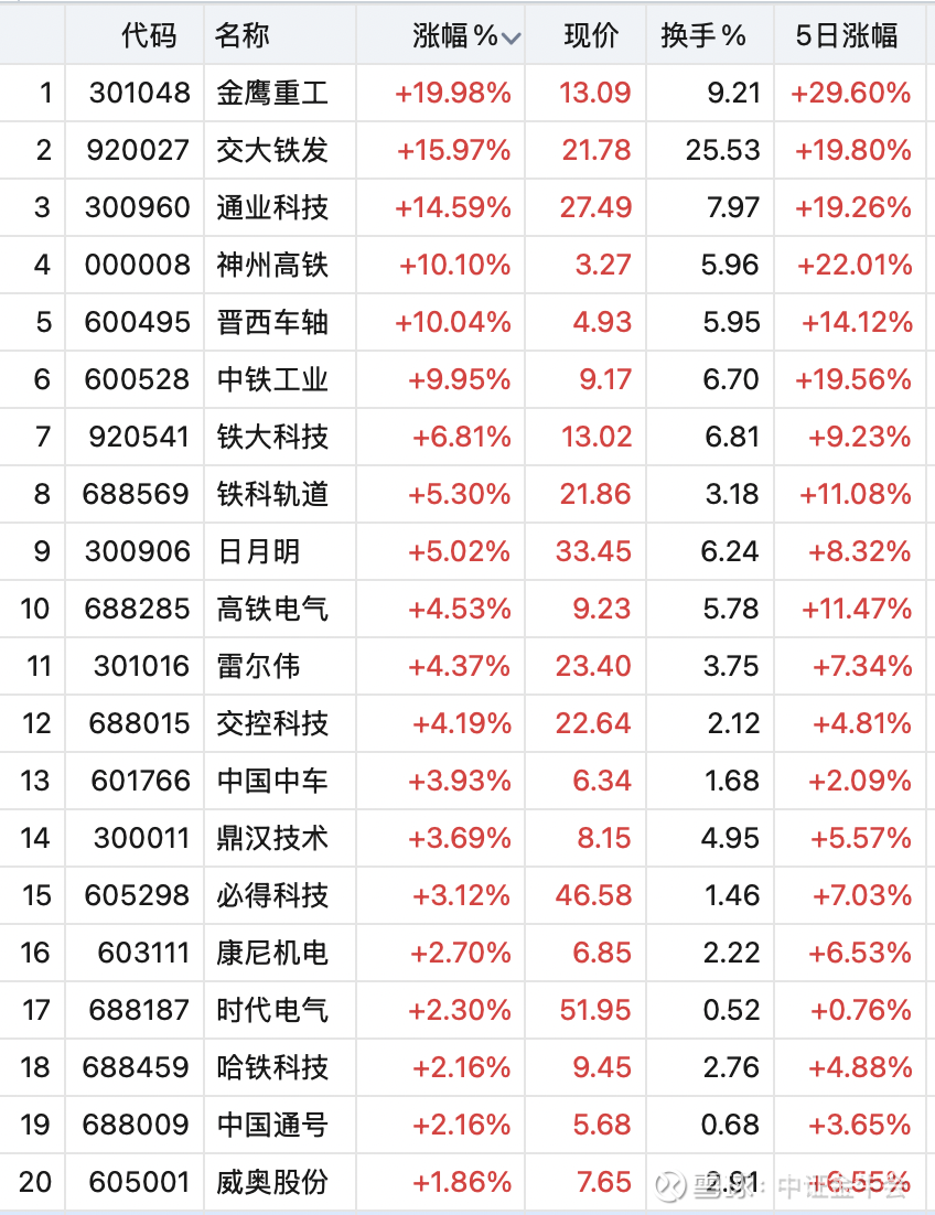 轨交设备涨幅居前个股