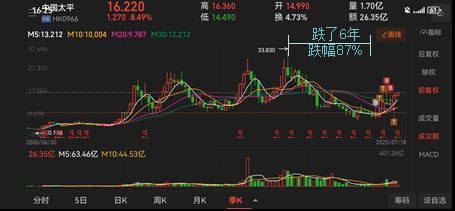 以中国太平为例,下面是中国太平季度K线,可以看出这只股票的周期性非常明显且确定,本轮周期从2018年3月跌到2024年3月,跌了6年,最大跌幅87%(疫情加上港股流动性危机,延长了本轮下跌周期,澳博控股等也是)。我在2024年1月30日建仓一直买到25年4月。