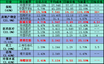 交易体系先就说这些,下面说下目前的持仓。今年持仓组合收益率24.29%,主要集中在保险、物业、医药医疗,还有部分博彩、化工、造纸、环保水泥。