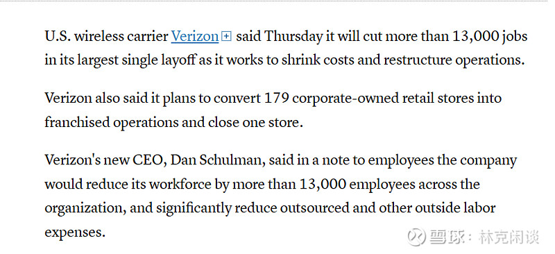 美国无线运营商Verizon周四表示,将裁减超过1.3万个工作岗位,为公司史上最大规模的单次裁员,旨在削减成本和重组业务。 Verizon CEO表示要大幅削减外包和其他外部劳动力成本,同时设立一项2000万美元的职业转型基金,帮助被裁员工专注于“在我们进入AI时代之际所面临的机遇和必要的技能”。