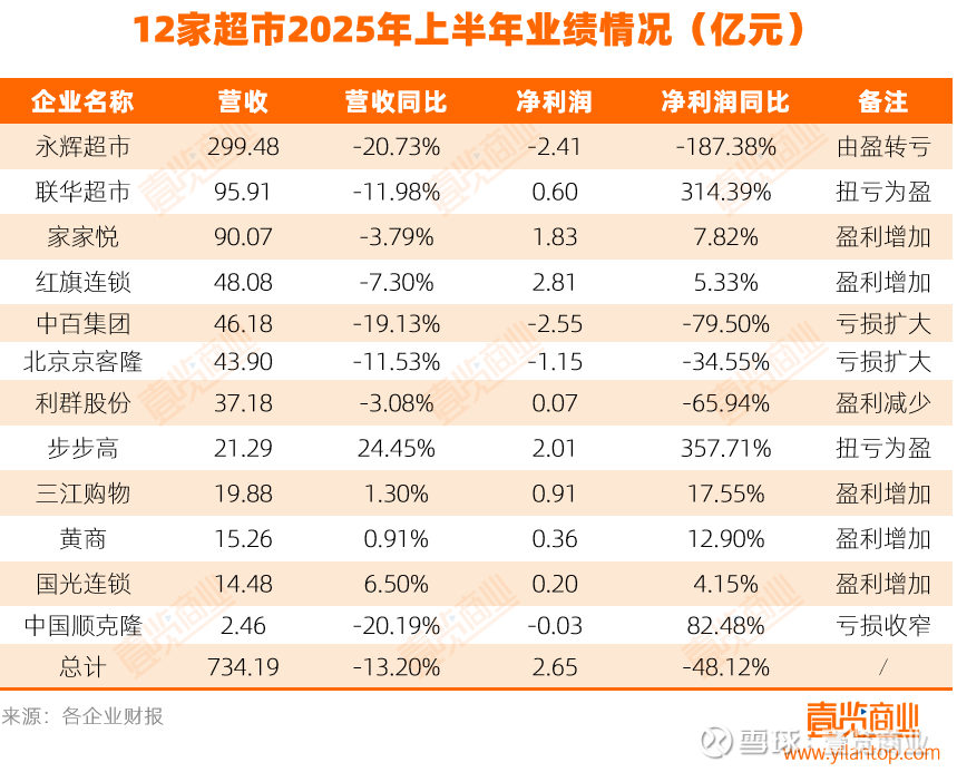 据壹览商业统计,2025年上半年,12家上市商超企业总营收为734.19亿元,同比下滑13.20%;总净利润达2.65亿元,同比下滑48.12%,近乎腰斩。
