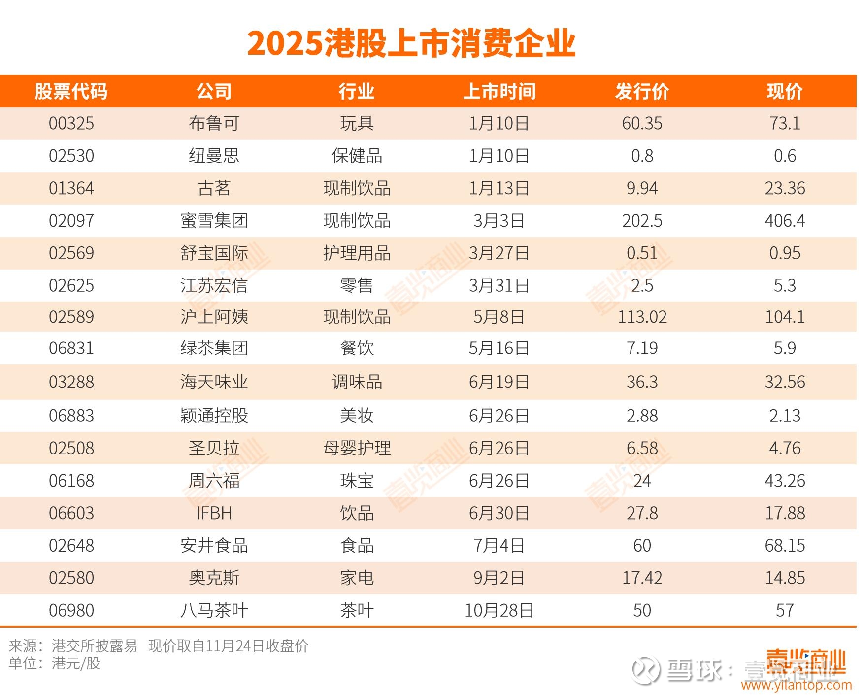 从时间分布看,港交所今年消费企业上市节奏明显加快:1月有布鲁可集团、纽曼思;3月迎来蜜雪冰城、江苏宏信、舒宝国际;5月沪上阿姨、绿茶集团登陆;6月成为密集窗口期,颖通控股、圣贝拉、周大福珠宝、海天调味集中上市;7月安井食品发行;10月八马茶业收官,形成全年消费板块的集中爆发。